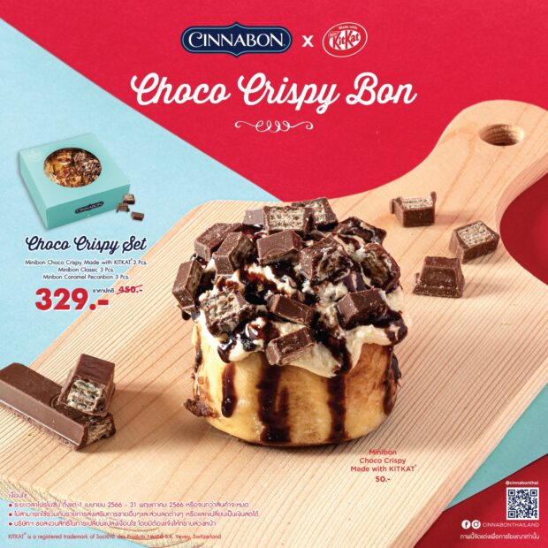 @ ซินนาบอน จับมือ KitKat มาระเบิดความฟินคู่กับซินนาบอนแบบจัดเต็มบนฟรอสติ้งครีมกลายเป็น “ช็อกโก คริสปี้ บอน” ความอร่อยใหม่สุดว้าว! เพียงชิ้นละ 50 บาท หรือเลือกอร่อยแบบยกกล่องสุดคุ้ม “ช็อกโก คริสปี้ เซต” กล่องรวมความอร่อยของ มินิบอน ช็อกโก คริสปี้ เมด วิธ คิทแคท 3 ชิ้น, มินิบอน คลาสสิก 3 ชิ้น และมินิบอน คาราเมล พีแคน 3 ชิ้น ในราคาเพียง 329 บาท (จากปกติ 450 บาท) ตั้งแต่วันนี้-31 พฤษภาคม 2566 ที่ร้านซินนาบอนทุกสาขา ดูรายละเอียดเพิ่มเติม www.facebook.com/cinnabonthailandfanpage