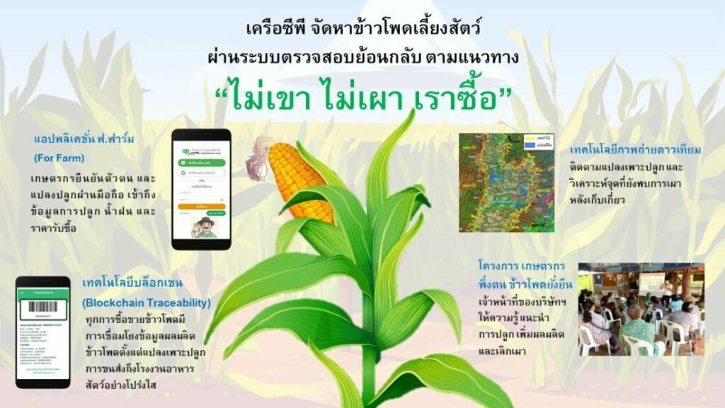 บริษัทฯ ประยุกต์ใช้เทคโนโลยีภาพถ่ายดาวเทียมในการติดตามแปลงเพาะปลูก และวิเคราะห์จุดที่ยังพบการเผาหลังเก็บเกี่ยวเพื่อให้เจ้าหน้าที่ของบริษัทฯ ลงพื้นที่ให้คำแนะนำเกษตรกรเลิกการเผาตอซังหลังเก็บเกี่ยว เพื่อสร้างหลักประกันว่าบริษัทฯ จัดหาข้าวโพดเลี้ยงสัตว์มาจากแหล่งปลูกที่ปราศจากการเผา ปัจจุบัน ข้าวโพดเลี้ยงสัตว์ที่ใช้ในกิจการประเทศไทย 100% สามารถตรวจสอบย้อนกลับได้ถึงแหล่งปลูกที่มีเอกสารสิทธิ์ถูกต้องตามกฎหมาย ไม่บุกรุกพื้นที่ป่า และหลีกเลี่ยงการเผา รวมทั้งยังเพิ่มความเชื่อมั่นด้วยเทคโนโลยีบล็อกเชน (Blockchain Traceability) ที่เชื่อมโยงข้อมูลผลผลิตข้าวโพดตั้งแต่แปลงเพาะปลูกถึงโรงงานอาหารสัตว์ และจัดทำแอปพลิเคชั่น ฟ.ฟาร์ม (For Farm) ขึ้นช่วยอำนวยความสะดวกให้เกษตรกรไทยในการลงทะเบียนยืนยันตัวตนและพื้นที่ปลูก