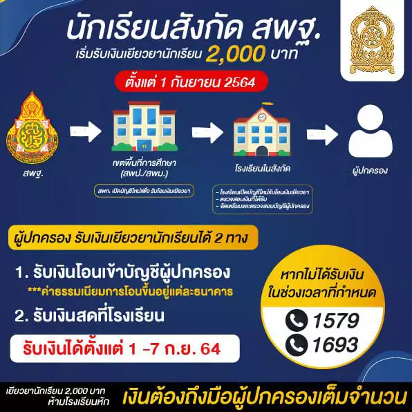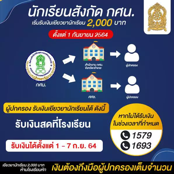 -สังกัดสำนักงานคณะกรรมการการศึกษาขั้นพื้นฐาน (สพฐ.) รับเงินเยียวยานักเรียน คนละ 2,000 บาท ทั้งการรับเงินโอนเข้าบัญชีหรือรับเงินสดที่โรงเรียน รับเงินได้ตั้งแต่วันที่ 1-7 กันยายน 2564