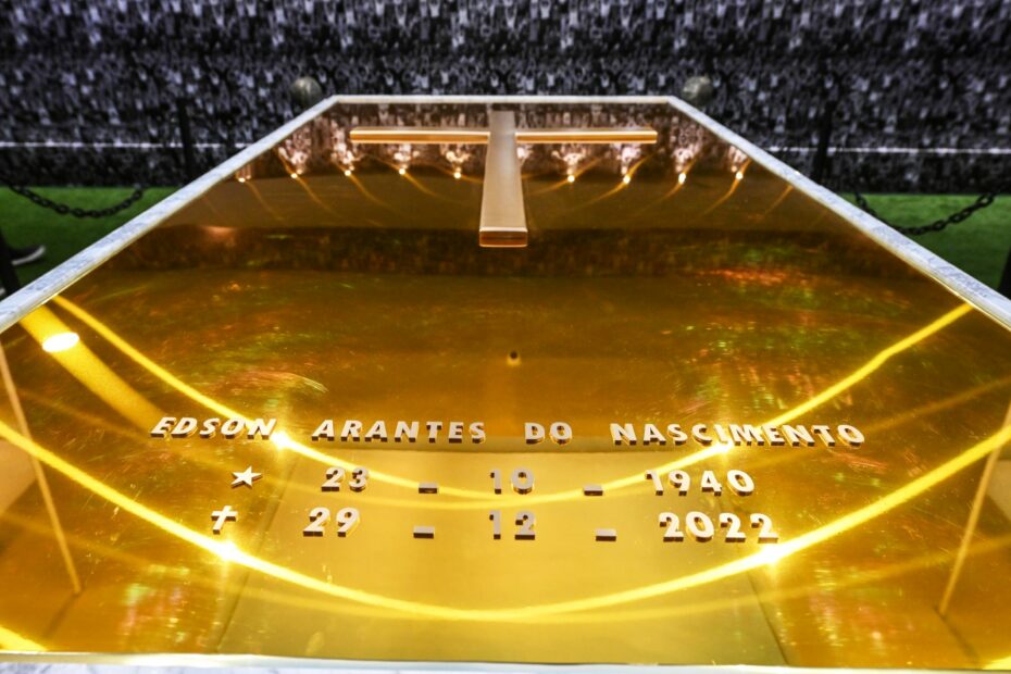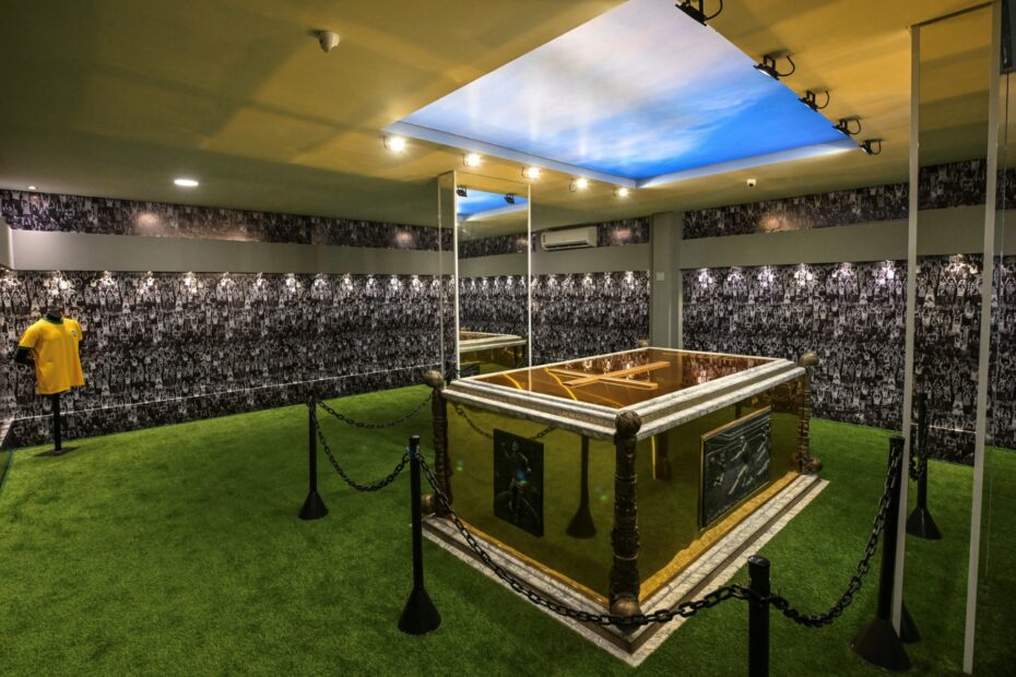 ขณะที่ภายในสุสานพื้นที่ 200 ตารางเมตร ถูกปูพื้นด้วยหญ้าเทียม และผนังทั้ง 4 ด้าน ถูกประดับไว้ด้วยรูปแฟนบอลพร้อมซาวด์แทร็กเสียงเชียร์ โดยมีหีบศพทองคำของ เปเล่ ซึ่งเป็นนักเตะคนแรก และคนเดียวที่คว้าแชมป์ฟุตบอลโลก มาครองได้ถึง 3 สมัย ตั้งตระหง่านอยู่กลางห้อง