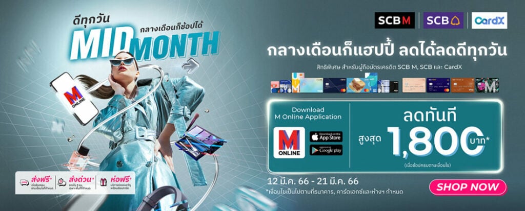 @ เดอะมอลล์ จับมือ ธนาคารไทยพาณิชย์ จัดแคมเปญ “ดีทุกวัน” มอบสิทธิประโยชน์สุดพิเศษสำหรับลูกค้าบัตรธนาคารไทยพาณิชย์ ทุกประเภท ดังนี้ บัตรเครดิต SCB M, SCB, CardX และบัตรกดเงินสด SCB M SPEEDY CASH, CardX SPEEDY CASH เท่านั้น ตั้งแต่วันนี้-31 กรกฎาคม 2566 พิเศษ ช่วงกลางเดือน ตั้งแต่วันที่ 12-21 ของทุกเดือน (มี.ค.-ก.ค. 2566) กับโปรโมชั่น “MID MONTH ดีทุกวัน” กลางเดือนช้อปดี เพราะมีดีลพิเศษ รับโค้ดส่วนลดเพิ่มสูงสุด 1,800 บาท เมื่อชำระผ่านบัตรเครดิต SCB M, SCB และ CardX ที่ร่วมรายการ ดูรายละเอียดเพิ่มเติมได้ที่ https://www.facebook.com/MonlineThailand/