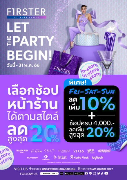 @ FIRSTER BY KING POWER เอาใจสายช้อปอย่างต่อเนื่อง ฉลองเดือนเกิดแบบนอนสต็อป! กับแคมเปญ “LET THE PARTY BEGIN โปรฯ สุดมันส์ ช้อปให้ทันดีลแรง!” ยกทัพสินค้าแบรนด์ดัง อาทิ AMERICAN TOURISTER, AUTOBOT, BALMAIN PARIS HAIR COUTURE, CONVERSE, CULTI MILANO, DR.BARBARA STURM, FITBIT, FOREO, HYDRO FLASK, LOGITECH, VERSO SKINCARE, YAO HAIRBRUSH และอื่นๆ อีกมากมาย มาพร้อมโปรโมชั่นจัดหนัก จัดเต็ม ลดสูงสุด 20% พิเศษ! เมื่อช้อปหน้าร้าน ทุกวันศุกร์-อาทิตย์ หรือ ช้อปออนไลน์ ทุกวันอังคาร-พฤหัสบดี รับส่วนลดเพิ่ม 10% เมื่อช้อปสินค้าที่ร่วมรายการ และเมื่อช้อปครบ 4,000 บาท ลดเพิ่มสูงสุด 20% ตั้งแต่วันนี้-31 พ.ค. 66 ที่หน้าร้าน FIRSTER BY KING POWER สาขาสยามสแควร์ ซอย 7 และสาขาคิง เพาเวอร์ มหานคร รวมถึงผ่านช่องทางการช้อปออนไลน์ที่ WWW.FIRSTER.COM และแอปพลิเคชัน FIRSTER BY KING POWER