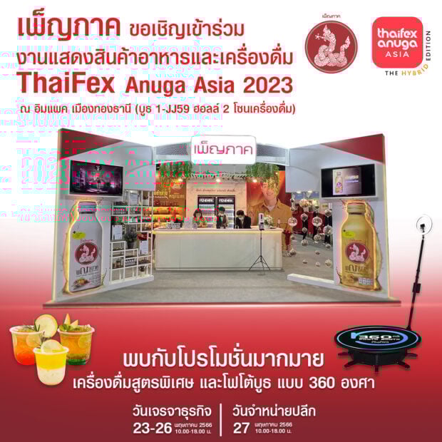 @ เพ็ญภาค ยกขบวนสินค้านวัตกรรมใหม่ๆ ทั้งกลุ่มสินค้าเครื่องดื่ม ไม่ว่าจะเป็น เครื่องดื่มสมุนไพรพญานาค (พลังกระชายดำ) และ พญานาค พร้อมท์ (ถั่งเช่า พร้อมท์ฟิต) และ เครื่องดื่มวิตามินซีมะขามป้อม เพ็ญภาคซีซ่า ร่วมออกบูธในงาน ThaiFex-Anuga Asia 2023 ณ บูธ 1-JJ59 (โซนเครื่องดื่ม) ณ ฮอลล์ 2 อิมแพ็ค เมืองทองธานี ระหว่างวันที่ 23-27 พฤษภาคม 2566 เวลา 10.00-20.00 น. พิเศษ! ในวันเสาร์ที่ 27 พฤษภาคม 2566 ตลอดวัน พบกับโปรโมชั่นมากมาย เครื่องดื่มสูตรพิเศษ สอบถามรายละเอียดเพิ่มเติมได้ทาง 0-2153-4115-20 ต่อ 321