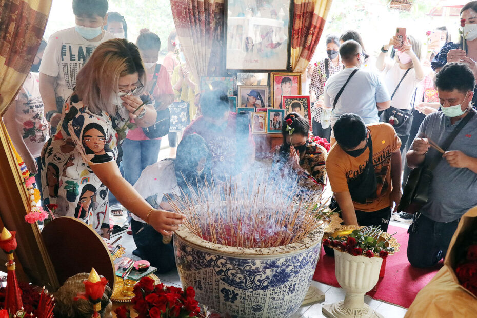 เมื่อวันที่ 27 พ.ค. ผู้สื่อข่าวรายงานว่า ยิ่งใกล้วันครบรอบการจากไป 31 ปี ของราชินีลูกทุ่ง “พุ่มพวง ดวงจันทร์” ผู้เป็นที่รักของบรรดาแฟนเพลงลูกทุ่ง รวมถึงบรรดาคอหวย และนักนิยมเสี่ยงโชค ทำให้บรรยากาศภายในวัดทับกระดาน ต.บ่อสุพรรณ อ.สองพี่น้อง จ.สุพรรณบุรี เริ่มครึกครื้นขึ้นมาทันที โดยเฉพาะที่หุ่นรูปปั้นที่ 1 “พุ่มพวง ดวงจันทร์” ที่ศาลาริมสระน้ำ หลังวัดทับกระดาน คอหวยไม่พลาดที่จะนำธูปเทียน ดอกกุหลาบสีแดงมากราบไหว้บูชาขอพร ขอโชคลาภ และขอเลขเด็ดกับดวงวิญญาณพุ่มพวง ขอให้มาบันดาลโชคลาภให้กับแฟนเพลง โดยการเสี่ยงเซียมซีเขย่าได้เลข 04-13-31-62-07-77-17-504-535 ตามลำดับ