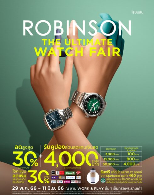 @ ห้างโรบินสัน ต่อยอดความสำเร็จงานมหกรรมนาฬิกาแห่งปี “ROBINSON THE ULTIMATE WATCH FAIR 2023” เอาใจครอบครัววอทช์เลิฟเวอร์ทั่วไทย โดยมาพร้อมดีลโปรโมชั่นที่ดีที่สุด อาทิ สินค้าราคาปกติลดสูงสุด 30% รับคูปองส่วนลดแทนเงินสดสูงสุด 4,000 บาท ใช้คะแนนลดเพิ่มและรับเครดิตเงินคืนรวมสูงสุด 30% จากบัตรเครดิตชั้นนำที่ร่วมรายการ ตั้งแต่วันที่ 29 พ.ค. 66-11 มิ.ย. 66 ณ ลานเวิร์ค แอนด์ เพลย์ ชั้น 1 ศูนย์การค้าเซ็นทรัลพระรามเก้า รายละเอียดเพิ่มเติมคลิก www.central.co.th รวมทั้ง Facebook Fanpage: Robinson Department Store