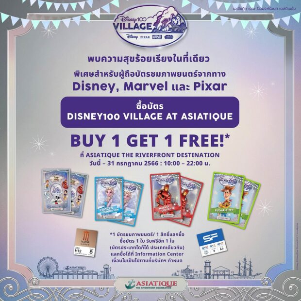 @ Disney100 Village at Asiatique ร่วมกับ Major Cineplex และ SF Cinema จัดโปรฯ ใหม่ แรงจุใจ เพียงโชว์ตั๋วหนังจากทาง “ดิสนีย์ มาร์เวล” และ “พิกซาร์” รับสิทธิพิเศษในการซื้อบัตรเข้าชมงาน Disney100 Village at Asiatique “ซื้อ 1 แถม 1” ตั้งแต่วันนี้-31 ก.ค. 2566 พิเศษผู้ซื้อบัตรที่ Information Counter โครงการเอเชียทีค เดอะ ริเวอร์ฟร้อนท์ เดสติเนชั่น รับส่วนลดค่าบัตร 15% ทันที เมื่อแต่งตัวตามธีมเจ้าหญิงองค์ต่างๆ ตั้งแต่วันนี้-30 มิ.ย. 2566 ติดตามรายละเอียดเพิ่มเติม ได้ที่ https://www.facebook.com/Asiatique.Thailand