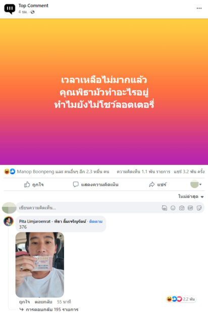 โดยในแฟนเพจชื่อดังอย่าง @Top Comment ได้ออกมาโพสต์ระบุว่า “เวลาเหลือไม่มากแล้ว คุณพิธามัวทำอะไรอยู่ ทำไมยังไม่โชว์ลอตเตอรี่” จนทำเอาชาวเน็ตเข้ามาคอมเมนต์กันเป็นจำนวนมาก