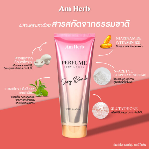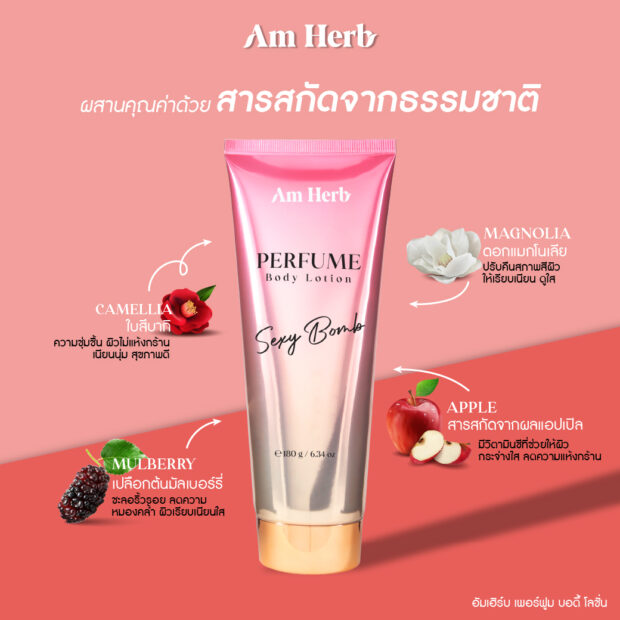 ผิวสวยสดใสย่อมเป็นสิ่งที่หญิงสาวทุกคนใฝ่ฝัน แต่ดียิ่งขึ้นไปอีกเมื่อ อัมเฮิร์บ เพอร์ฟูม บอดี้ โลชั่น ได้มอบความโดดเด่นให้ผิวสาวสว่างกระจ่างใส บูสต์ออร่าให้ผิวเปล่งประกายยิ่งขึ้นด้วย Shimmer พร้อมคงความชุ่มชื่นให้ผิวด้วยคุณค่าจาก Vitamin E ช่วยให้ผิวเนียนนุ่มแลดูสุขภาพดี อีกทั้งยังมีสารบำรุงผิวจาก Vitamin B3, Glutathione และ Magnolia Callus Extract จะมาเติมเต็มให้ผิวสว่างกระจ่างใสยิ่งขึ้น แต่เลอเลิศยิ่งไปกว่านั้น เมื่อเนื้อครีมยังมอบความหอมหวานของกลิ่น Berry & Floral นำส่งให้ผิวมีกลิ่นหอมละมุนใจผสมผสานความเซ็กซี่สุด ๆ ให้กับหญิงสาวได้อย่างสมบูรณ์แบบ