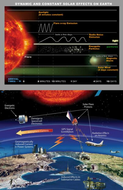 - ซึ่งเป็นที่ทราบกันว่าปรากฏการณ์ CME นั้นจะเกิดมากขึ้นเรื่อยๆ จนมีค่าสูงสุดในทุก 11 ปี หรือก็คือคาดการณ์กันว่าจะสูงสุดในปี ค.ศ. 2025 นี้ และทำให้ดวงอาทิตย์มีกิจกรรมการทำงานที่เกี่ยวกับแม่เหล็กไฟฟ้าสูงสุดในช่วงนั้น เรียกว่า เกิด “solar maxiumum โซลาร์แม็กซิมั่ม” ขึ้น และโลกก็มีความเสี่ยงเพิ่มขึ้นที่จะได้รับผลกระทบตามไปด้วย โดยอาจจะเกิด “พายุแม่เหล็กโลก (geometric storm)” ขึ้น ซึ่งส่งผลรบกวนบดบังสัญญาณของดาวเทียม การติดต่อสื่อสารด้วยวิทยุ ระบบอินเทอร์เน็ต และระบบสายส่งไฟฟ้า จนบางคนกลัวว่ามันจะเป็นการล่มสลายทางเทคโนโลยี