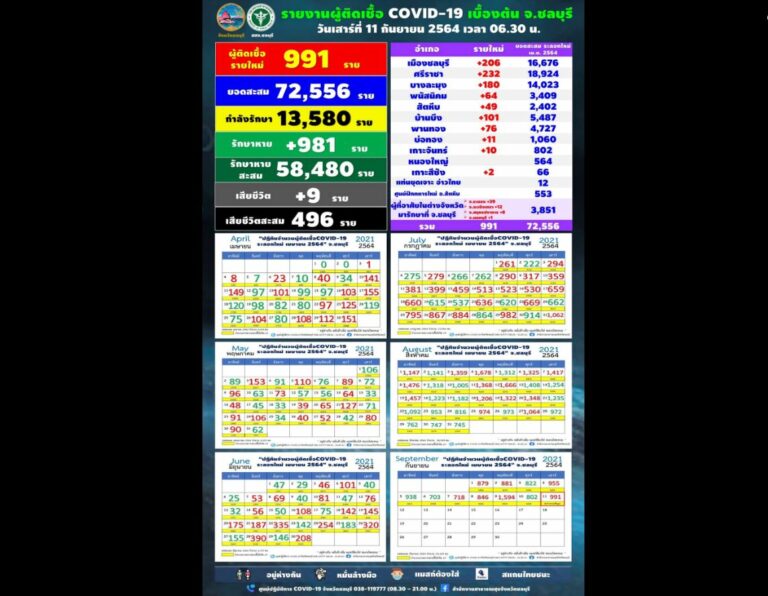 เมื่อวันที่ 11 ก.ย. ผู้สื่อข่าวรายงานว่า เพจ “สำนักงานประชาสัมพันธ์จังหวัดชลบุรี – Chonburi PR” โพสต์ภาพยอดผู้ป่วยติดเชื้อโควิด พร้อมข้อความระบุว่า วันนี้มีรายงานผู้ติดเชื้อโควิด-19 รายใหม่ จำนวน 991 ราย 1. บริษัท ทีดับบลิวที แมนูแฟคเจอร์ริ่ง จำกัด อำเภอพานทอง 4 ราย สะสม 59 ราย (ค้นหาเชิงรุกโครงการ Factory Sandbox ซึ่งอาจจะเป็นซากเชื้อแล้วส่วนหนึ่ง) 2. Cluster บริษัท CSSG (Subcontract บริษัทในอำเภอพานทอง) 16 ราย สะสม 39 ราย 3. Cluster บริษัท ไอดีเอ อินดัสเทรียล จำกัด อำเภอพานทอง 6 ราย สะสม 6 ราย 4. Cluster ห้องเช่า หมู่ 16 ตำบลหนองเหียง อำเภอพนัสนิคม 18 ราย สะสม 18 ราย 5. Cluster บริษัท แคชชวลโฮม (ไทยแลนด์) จำกัดอำเภอบ้านบึง 13 ราย สะสม 25 ราย