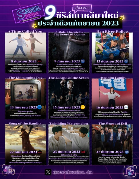 อันยองงงง..สวัสดีผู้อ่านที่น่ารักทุกท่านนะคะ มาพบกันดิฉัน “นูน่าเมี้ยน” เหยี่ยวข่าวสาวพราวเสน่ห์ของ “เดลินิวส์ออนไลน์” อีกแล้วนะคะ กับคอมลัมน์ “SeoulStation” ที่จะพาผู้อ่านทุกคนมาอัปเดต และเสิร์ฟความพิเศษสดๆ ร้อนๆ ข่าวสารความบันเทิงของเหล่า K-Pop นักแสดง ไอดอลเกาหลี ส่งตรงถึงหน้าบ้านแฟนๆ แบบฉบับของเรา สัปดาห์นี้ขอเอาใจสายคอซีรีส์นะคะ กับ “ปักหมุด ‘9 ซีรีส์เกาหลีมาใหม่’ ประจำเดือนกันยายน 2023” ว่าแต่จะมีเรื่องไหนน่าสนใจ และน่ารับชมบ้าง รีบตามมาอ่านกันเลย!!