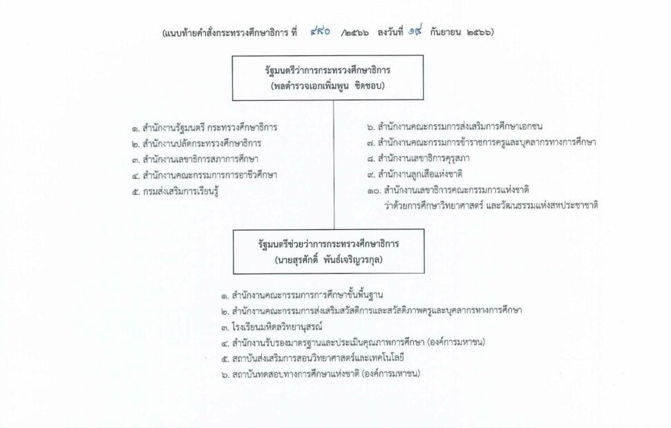 เมื่อวันที่ 15 ก.ย. พล.ต.อ.เพิ่มพูน ชิดชอบ รมว.ศึกษาธิการ ได้ลงนามในคำสั่งคำสั่งกระทรวงศึกษาธิการ ที่ สร 480/2566 สั่ง ณ วันที่ 14 กันยายน พ.ศ. 2566 เรื่อง มอบอำนาจให้รัฐมนตรีช่วยว่าการกระทรวงศึกษาธิการสั่งและปฏิบัติราชการแทน โดยมอบหมายอำนาจหน้าที่ให้ นายสุรศักดิ์ พันธ์เจริญวรกุล รัฐมนตรีช่วยว่าการกระทรวงศึกษาธิการ กำกับดูแลหน่วยงานในสังกัด/ในกำกับ ดังนี้ มอบหมายและมอบอำนาจให้สั่งและปฏิบัติราชการแทน รมว.ศธ. โดยมุ่งเน้นให้เกิดประสิทธิภาพในการปฏิบัติราชการของสำนักงานคณะกรรมการการศึกษาขั้นพื้นฐาน (สพฐ.) มอบหมายให้กำกับดูแลโดยมุ่งเน้นให้เกิดประสิทธิภาพในการปฏิบัติราชการในหน่วยงานดังต่อไปนี้ โรงเรียนมหิดลวิทยานุสรณ์ สำนักงานรับรองมาตรฐานและประเมินคุณภาพการศึกษา (องค์การมหาชน) สถาบันส่งเสริมการสอนวิทยาศาสตร์และเทคโนโลยี สถาบันทดสอบทางการศึกษาแห่งชาติ (องค์การมหาชน) สำนักงานคณะกรรมการส่งเสริมสวัสดิการและสวัสดิภาพครูและบุคลากรทางการศึกษา