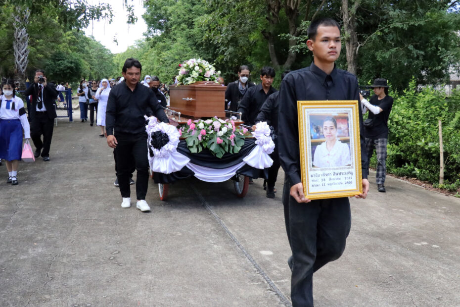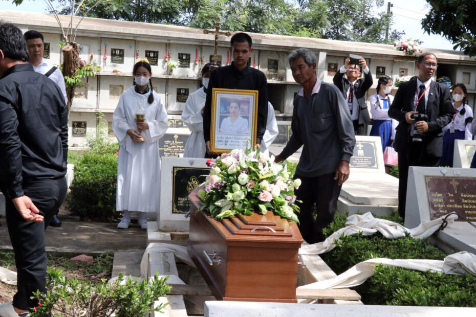 ในเวลาต่อมาญาติจึงได้เคลื่อนร่าง “ครูเจี๊ยบ” ไปยังสุสานซึ่งอยู่ด้านหลังของโบสถ์วัดแม่พระประจักษ์ ทางด้านปีกซ้าย แถวที่ 3 กุฎีที่ 6 หมายเลข 1-1-0318 ภายในสุสานวัดแม่พระประจักษ์ เป็นกุฎีเดียวกับ เปโตร ธีระชัย สินประเสริฐ อายุ 45 ปี พี่ชายคนโต “ครูเจี๊ยบ” ที่เสียชีวิตลง เมื่อวันที่ 18 มกราคม 2564 ท่ามกลางความเศร้าโศกเสียใจของครอบครัว รวมถึงบรรดาญาติ คณะซิสเตอร์ ครูอาจารย์ และนักเรียนโรงเรียนพระหฤทัยคอนแวนต์ และเพื่อนสนิทของ “ครูเจี๊ยบ” เป็นอย่างมาก