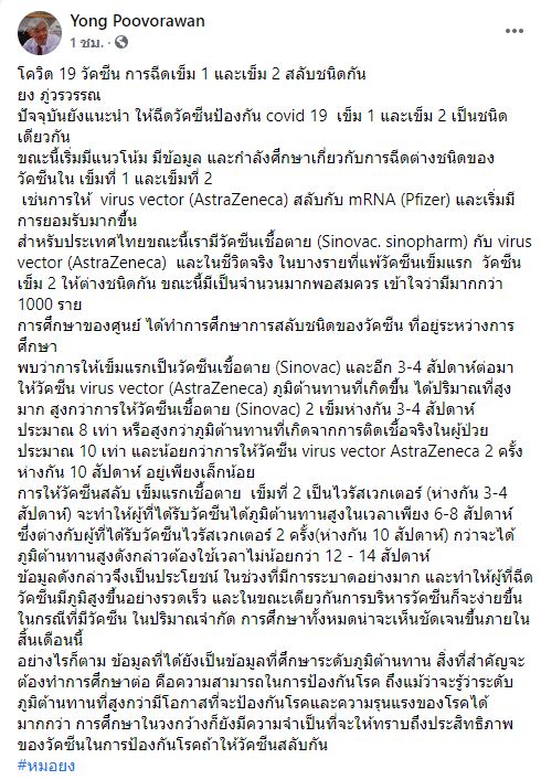 เมื่อวันที่ 7 ก.ค. ผู้สื่อข่าวรายงานว่า ศ.นพ.ยง ภู่วรวรรณ หัวหน้าศูนย์เชี่ยวชาญเฉพาะทางด้านไวรัสวิทยา คลินิกภาควิชากุมารเวชศาสตร์ คณะแพทยศาสตร์ จุฬาลงกรณ์มหาวิทยาลัย โพสต์เฟซบุ๊กส่วนตัว “Yong Poovorawan” ระบุข้อความว่า “โควิด 19 วัคซีน การฉีดเข็ม 1 และเข็ม 2 สลับชนิดกัน ปัจจุบันยังแนะนำ ให้ฉีดวัคซีนป้องกัน covid 19 เข็ม 1 และเข็ม 2 เป็นชนิดเดียวกัน