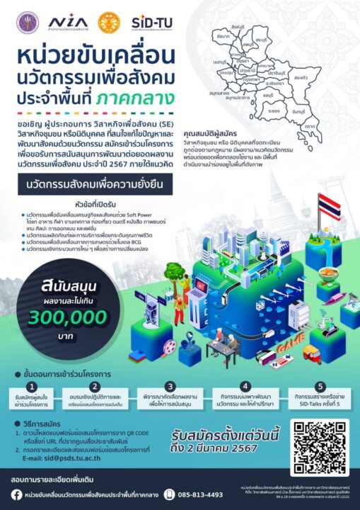 ที่สำคัญตอนนี้ ว. ป๋วย ยังทำหน้าที่เป็น หน่วยขับเคลื่อนนวัตกรรมทางสังคมประจำพื้นที่ภาคกลาง โดยมีความร่วมมือกับ สำนักงานนวัตกรรมแห่งชาติ (NIA) ซึ่งตอนนี้ได้ เปิดรับสมัครผู้ประกอบการ วิสาหกิจชุมชน SE หรือนิติบุคคล ที่สนใจแก้ปัญหาสังคมด้วยนวัตกรรม มาร่วมโครงการ โดยมีทุนสนับสนุนภายใต้แนวคิด “นวัตกรรมสังคมเพื่อความยั่งยืน” เช่น การขับเคลื่อนเศรษฐกิจสร้างสรรค์ด้วย Soft Power นวัตกรรมเพื่อยกระดับชีวิต นวัตกรรมภาคเกษตรด้วยโมเดล BCG และนวัตกรรมเชิงกระบวนการใหม่ ๆ เพื่อสร้างการเปลี่ยนแปลง โดยในปีที่ผ่านมา ได้มีนวัตกรรมเด่น ๆ อาทิ ระบบบริหารจัดการตู้ยาโรงเรียนแบบคลาวด์, กับดักแมลงโซลาร์เซลล์อัตโนมัติ, นวัตกรรมเปลี่ยนขยะเศษอาหารเป็นสวนผักคนเมือง, ผลิตภัณฑ์ศิลปะจากวัสดุรีไซเคิล, หนังเทียมจากฟางข้าว, เจลลีผลไม้โปรตีนสูงสำหรับผู้ป่วยมะเร็ง Application Blind Help เป็นต้น โดยสามารถสอบถามรายละเอียดเพิ่มเติมได้ที่ “ว.ป๋วย” และเปิดรับสมัครตั้งแต่วันนี้ไปจนถึงวันที่ 2 มีนาคม 2567 นะครับ เพื่อมาคิดค้นนวัตกรรมที่ช่วยเปลี่ยนแปลงสังคมกัน…เพื่ออนาคตที่ยั่งยืน.