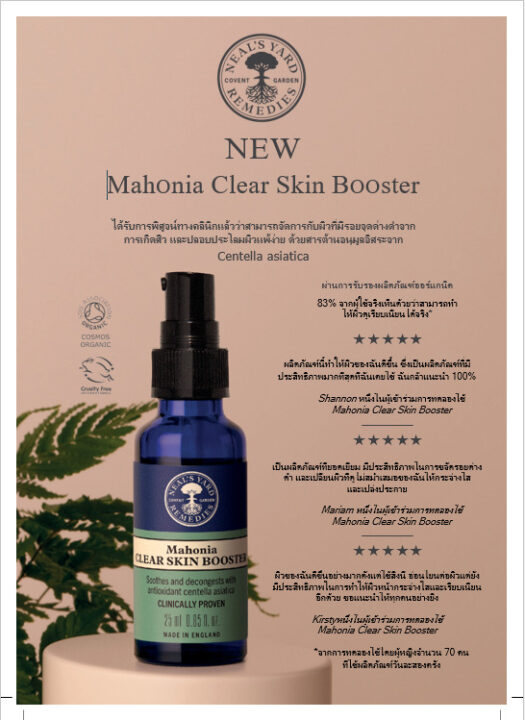 Mahonia Clear Skin Booster ตัวใหม่นี้เหมาะสำหรับผู้ที่มีผิวเป็นสิวได้ง่าย สามารถใช้ทาทั่วใบหน้า หรือแต้มเฉพาะจุดที่เกิดปัญหา ช่วยลดร่องรอยจากการเกิดสิว รอยแดง จุดด่างดำดูจางลง ด้วยการคิดค้นสูตรอย่างเชี่ยวชาญจากโรงงานที่เป็นมิตรต่อสิ่งแวดล้อมของ Neal’s Yard Remedies ในเมืองดอร์เซต ประเทศอังกฤษ จากส่วนผสมออร์แกนิกที่ได้รับการรับรองและมีกรรมวิธีการเพาะปลูกอย่างยั่งยืน ซึ่งมีเอกลักษณ์เฉพาะตัว ประกอบด้วย: