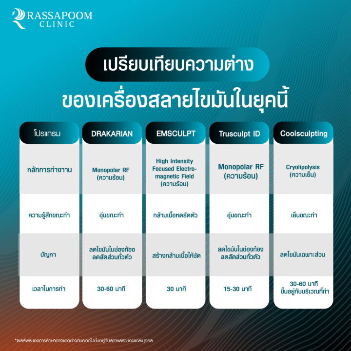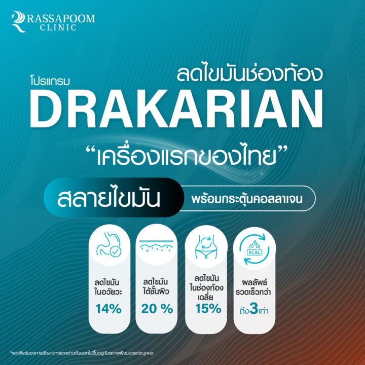 คุณหมอหนุ่ม – อาจารย์นายแพทย์ รัสมิ์ภูมิ เผยว่า รัสมิ์ภูมิคลินิก มีใช้เทคโนโลยีใหม่ที่ช่วยสลายไขมันลงลึกถึงระดับเซลล์ เครื่องแรกของเอเชียและของไทยที่สามารถลด Visceral Fat ได้ พร้อมสลายไขมันและช่วยในการกระตุ้นสร้างคอลลาเจนและอิลาสตินใต้ชั้นผิวโดยไม่ต้องผ่านการผ่าตัด ไม่ต้องพักฟื้น ซึ่งโปรแกรม DRAKARIAN สลายไขมันใต้ผิว ใช้เทคโนโลยี VF®Technology คลื่นความถี่วิทยุ (Radio Frequency) 3 ความถี่ ที่ 0.8mHz, 1.0mHz,และ 1.2mHz ด้วยสามความถี่ที่มีความแตกต่างกัน จึงทำให้ตัวเครื่องสามารถปรับตัวให้เข้ากับพยาธิสภาพของร่างกายเพื่อให้ได้รับพลังงานที่สูงที่สุด และมีประสิทธิภาพดีที่สุดโปรแกรม DRAKARIAN สลายไขมันใต้ผิวยังเป็นเครื่องที่ได้รับมาตรฐานผ่านการรับรองจาก US FDA จึงมีความปลอดภัยในตัวเครื่องสูง
