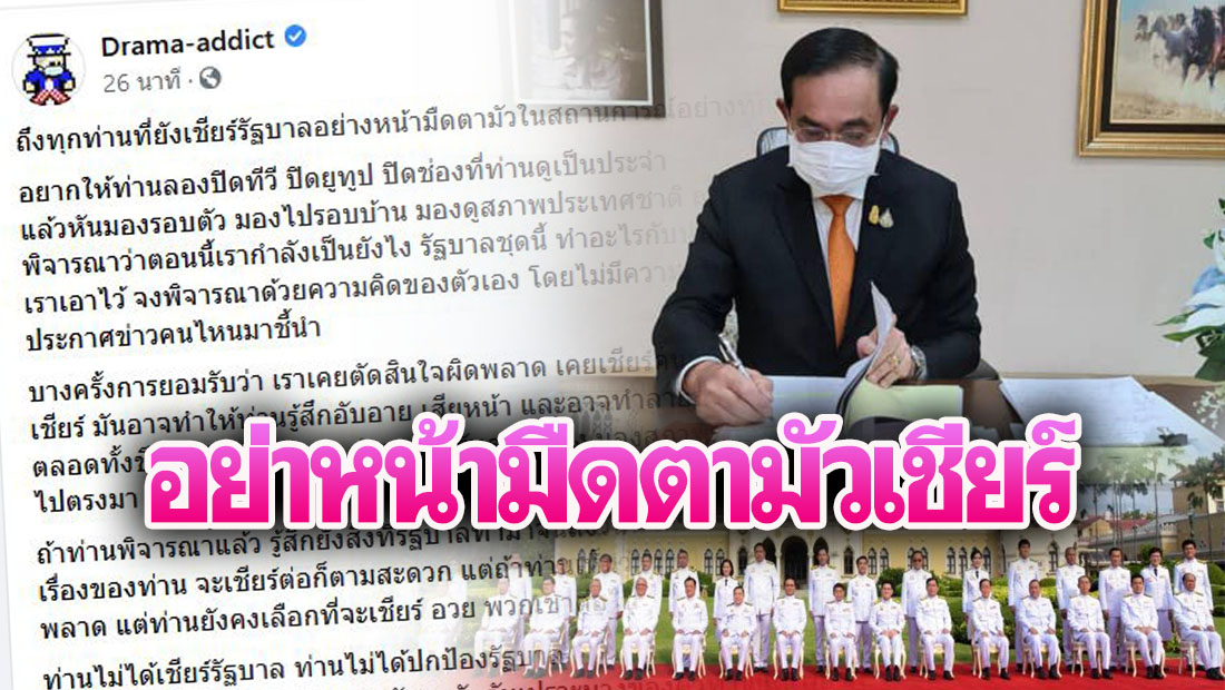 เมื่อวันที่ 8 ก.ค. เพจดัง Drama-addict ได้โพสต์ข้อความระบุว่า ถึงทุกท่านที่ยังเชียร์รัฐบาลอย่างหน้ามืดตามัวในสถานการณ์อย่างทุกวันนี้ อยากให้ท่านลองปิดทีวี ปิดยูทูบ ปิดช่องที่ท่านดูเป็นประจำ แล้วหันมองรอบตัว มองไปรอบบ้าน มองดูสภาพประเทศชาติ ณ ปัจจุบันนี้ แล้วพิจารณาว่าตอนนี้เรากำลังเป็นยังไง รัฐบาลชุดนี้ ทำอะไรกับประเทศชาติของเราเอาไว้ จงพิจารณาด้วยความคิดของตัวเอง โดยไม่มีความเห็นของสื่อหรือผู้ประกาศข่าวคนไหนมาชี้นำ