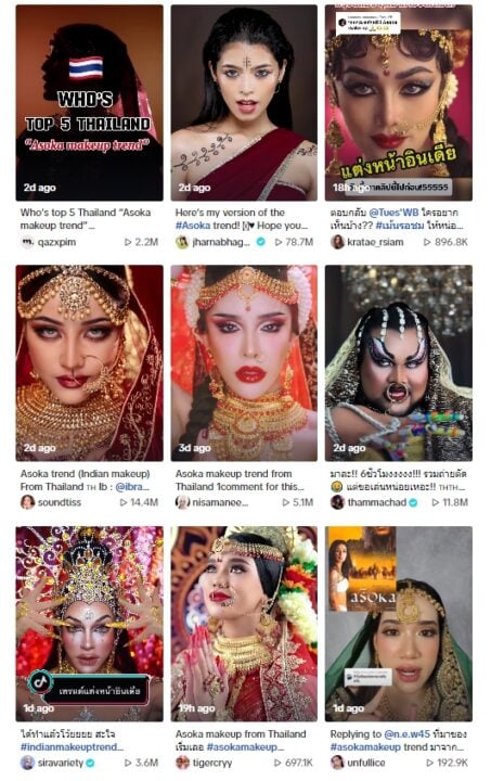 เรียกได้ว่ากำลังกลายเป็นไวรัลคอนเทนต์ชาเลนจ์ที่เหล่าชาวเน็ตบนโลกออนไลน์ต่างพากันให้ความสนใจ และทำตามกันอยู่ไม่น้อย สำหรับเทรนด์ “Asoka makeup” ซึ่งเป็นคลิปการแต่งหน้าแบบอินเดียที่ต้องใช้เวลาในการตัดต่อนาน โดยหากใครที่ทำก็จะได้รับคำชื่นชมจากชาวเน็ตอย่างมากมาย เพราะยากและใช้เวลานานนั้น