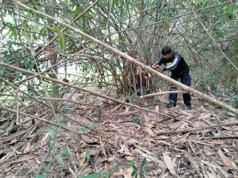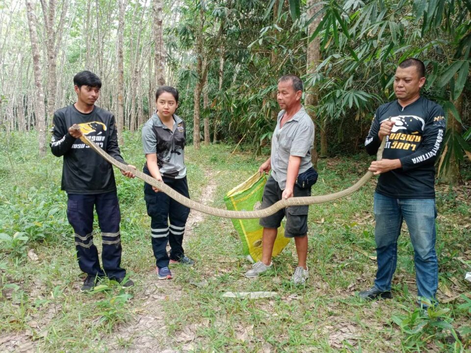 เมื่อวันที่ 3 มิ.ย. 67 ทีมงานอสรพิษวิทยาภาคใต้ นำโดยนาย ทวีศักดิ์ บุญเศษ นายเอกสิทธิ์ จันทร์พร้อย น.ส.เขมิกา จันทร์คง พร้อมกับทีมกู้ชีพ อบต.สะท้อน และกู้ชีพ อบต.คูหา ร่วมลงพื้นที่ย้ายรังงูจงอางในพื้นที่บ้านนายสี หมู่ 4 ต.ทุ่งตำเสา อ.หาดใหญ่ จ.สงขลา หลังรับแจ้งขอความช่วยเหลือจาก นายจรัญ จันทร์แก้ว อายุ 49 ปี เจ้าของสวนยาง ว่ามีงูจงอางตัวใหญ่และยาวมามาทำรังวางไข่อยู่ในกอไผ่ติดกับสวนยางจนไม่กล้ากรีดยาง เพราะกลัวงูจงอางตัวนี้จะทำร้ายเพราะดุมาก หากใครเข้าใกล้รังจะชูคอขู่ตลอด ชาวบ้านกลัวมาก แต่ไม่มีใครกล้าจับ
