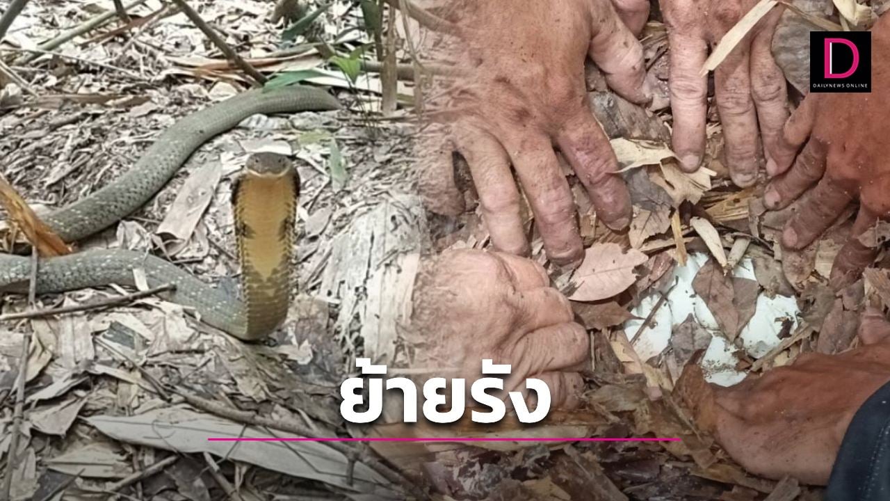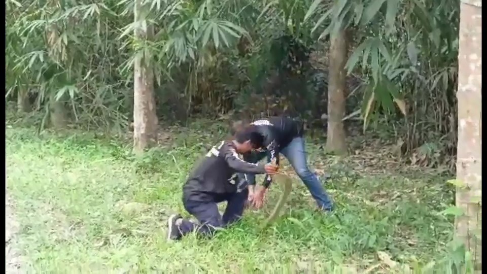 หลังจากลงพื้นที่ไปยังจุดที่จงอางตัวนี้ทำรังวางไข่อยู่ ก็พบงูจงอางขนาดใหญ่ซ่อนตัวอยู่ในกอไผ่โผล่แต่หัว และพบว่ามันกำลังกลืนกินงูสิงเข้าไปเกือบหมดตัวเหลือเฉพาะหาง ก็ปล่อยให้มันกินให้เสร็จ เพื่อรอให้มันเลื้อยกลับเข้าไปที่รังว่าอยู่ตรงไหนของกอไผ่ พอรู้พิกัดที่แน่ชัด ทีมจับก็เข้าไปล้อมบริเวณกอไผ่เพื่อวางแผนจับ แต่พองูจงอางเห็นคน มันก็ชูคอพร้อมสู้ทันทีเพราะหวงไข่มาก และค่อนข้างอันตรายมากเพราะสภาพพื้นที่เป็นกอไผ่และรกทึบจับยาก ทีมจับต้องใช้ความระมัดระวัง
