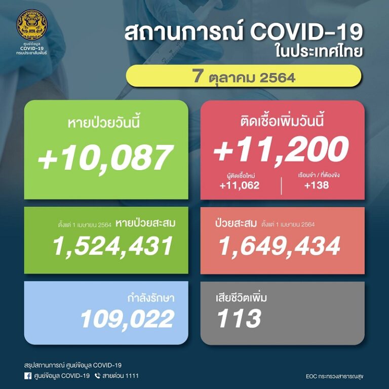 เมื่อวันที่ 7 ต.ค. ผู้สื่อข่าวรายงานว่า ศูนย์บริหารสถานการณ์การแพร่ระบาดของโรคติดเชื้อไวรัสโคโรนา 2019 (ศบค.) สรุปภาพรวมสถานการณ์โควิด-19 พบผู้ป่วยรายใหม่ 11,200 ราย, ป่วยสะสม 1,678,297 ราย, รักษาหายเพิ่ม 10,087 ราย, อยู่ระหว่างรักษาตัว 109,022 ราย ในจำนวนนี้อาการหนัก 3,000 ราย และใส่เครื่องช่วยหายใจ 715 ราย, เสียชีวิตเพิ่ม 113 ราย รวมเสียชีวิตสะสม 17,324 ราย ส่วนยอดสะสมผู้ที่ได้รับวัคซีนป้องกันโรคโควิด-19 ตั้งแต่วันที่ 28 ก.พ.-6 ต.ค.2564 มีจำนวน 57,387,052 โด๊ส แบ่งเป็นผู้ที่ได้รับวัคซีน เข็มที่ 1 จำนวน 33,774,684 ราย, เข็มที่ 2 จำนวน 22,005,722 ราย, เข็มที่ 3 จำนวน 1,606,646 ราย