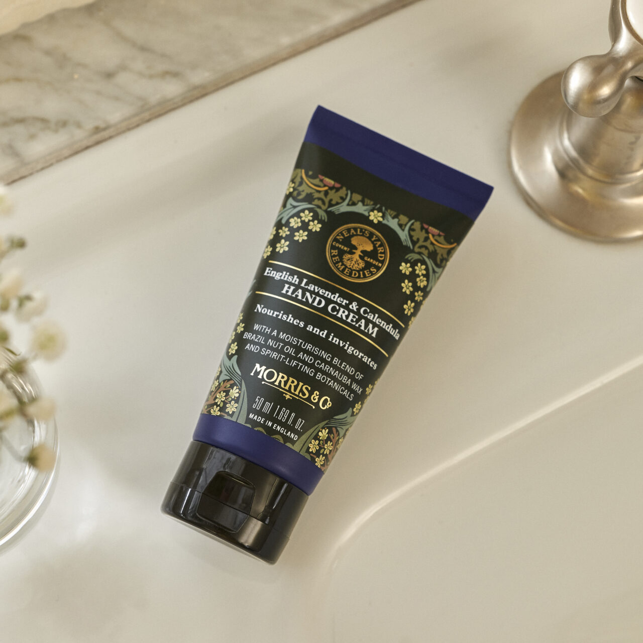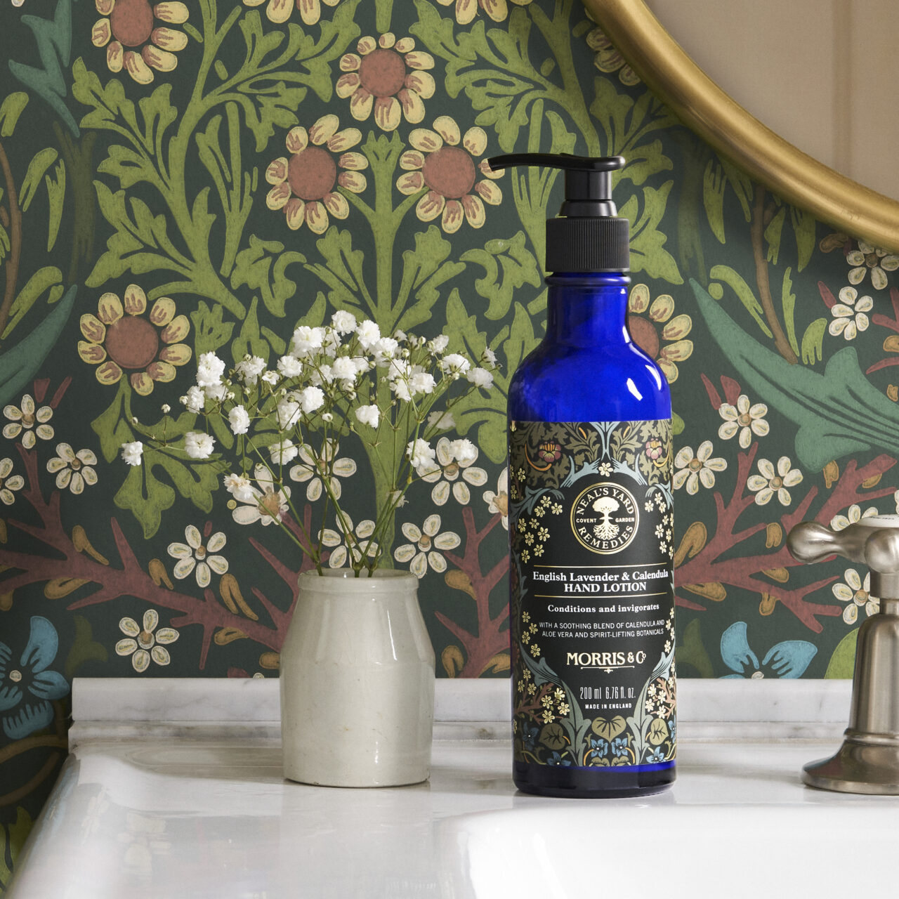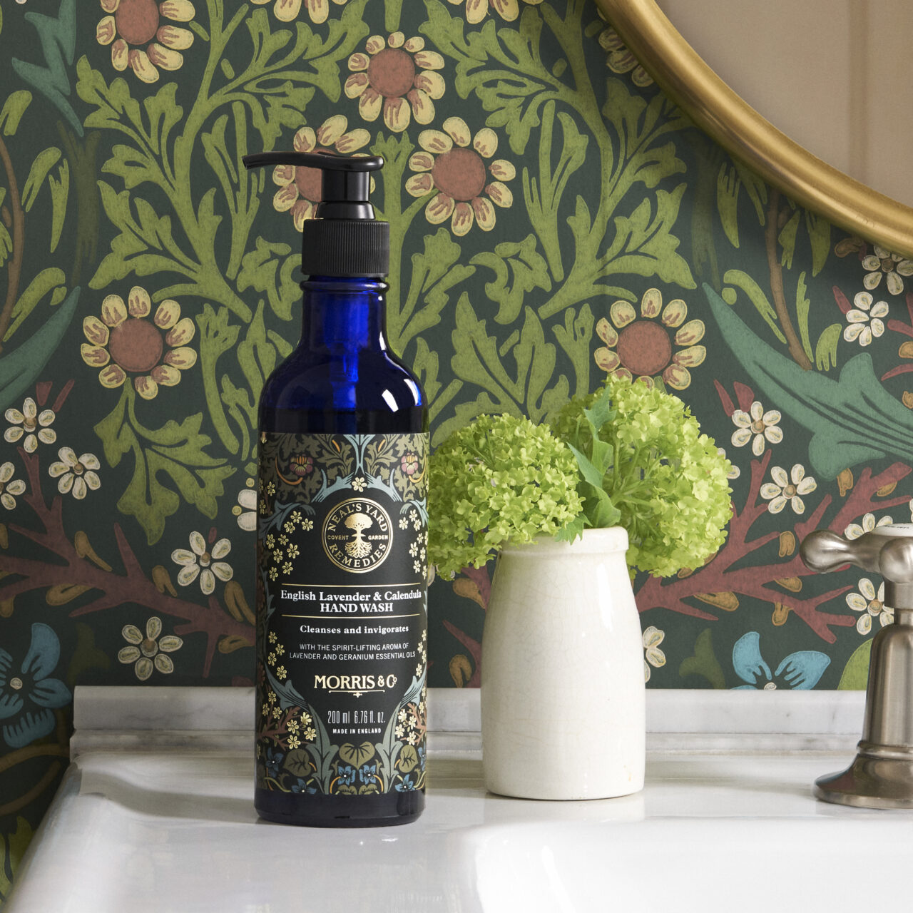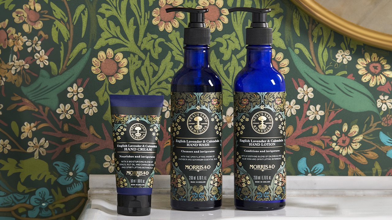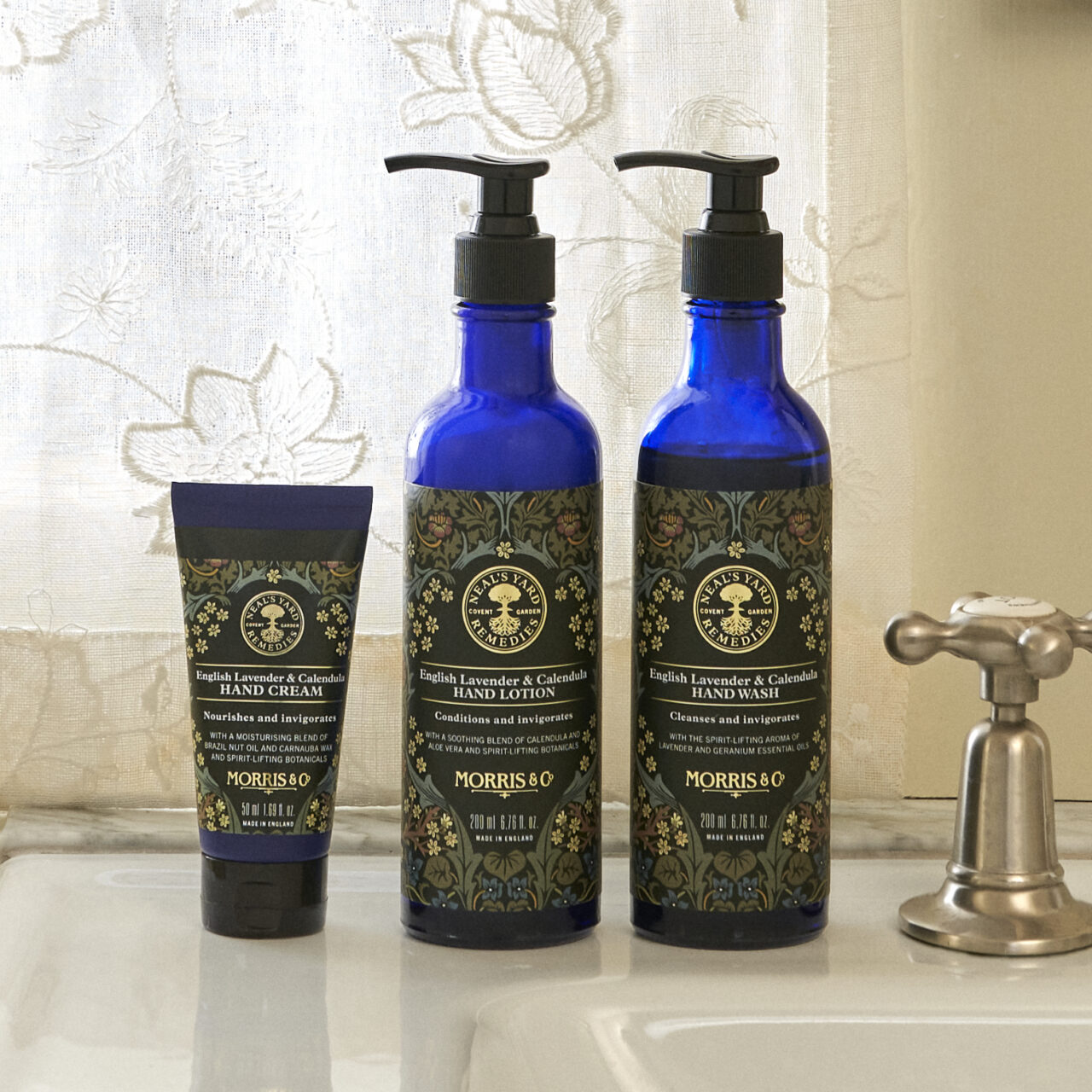 The English Lavender & Calendula Hand Care Collection นำเสนอในขวดสีน้ำเงินอันเป็นเอกลักษณ์ของ Neal’s Yard Remedies ห่อด้วยลายพิมพ์ Blackthorn สดใสของ Morris & Co. และตกแต่งด้วยโลโก้ฟอยล์สีทองให้ความรู้สึกที่หรูหรา