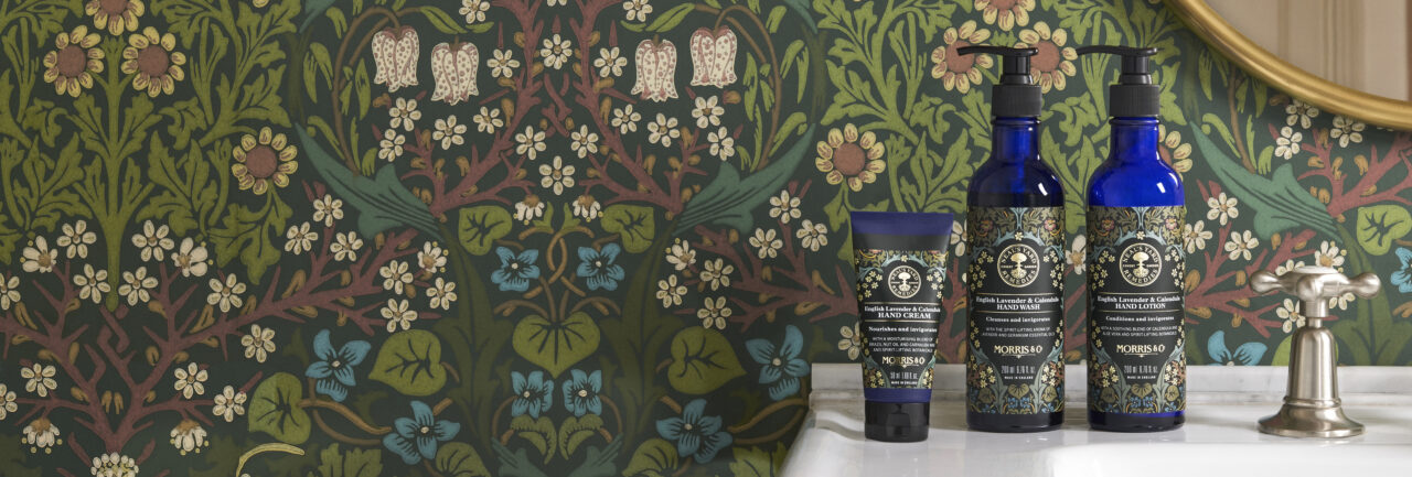 Morris & Co. และ Neal’s Yard Remedies มีความมุ่งมั่นร่วมกันมาอย่างยาวนาน ในการอนุรักษ์และปกป้องความหลากหลายทางชีวภาพ ร่วมกันสร้างสรรค์และวาดแรงบันดาลใจลงบนขวดสีน้ำเงิน จากผลงานภาพพิมพ์ของมอร์ริส ในปี 1882 ‘Blackthorn’ ภาพพิมพ์ประกอบด้วยดอกไม้สีม่วงและดอกเดซี่สีเหลือง ที่รวบรวมความรักของมอร์ริสที่มีต่อโลกธรรมชาติ