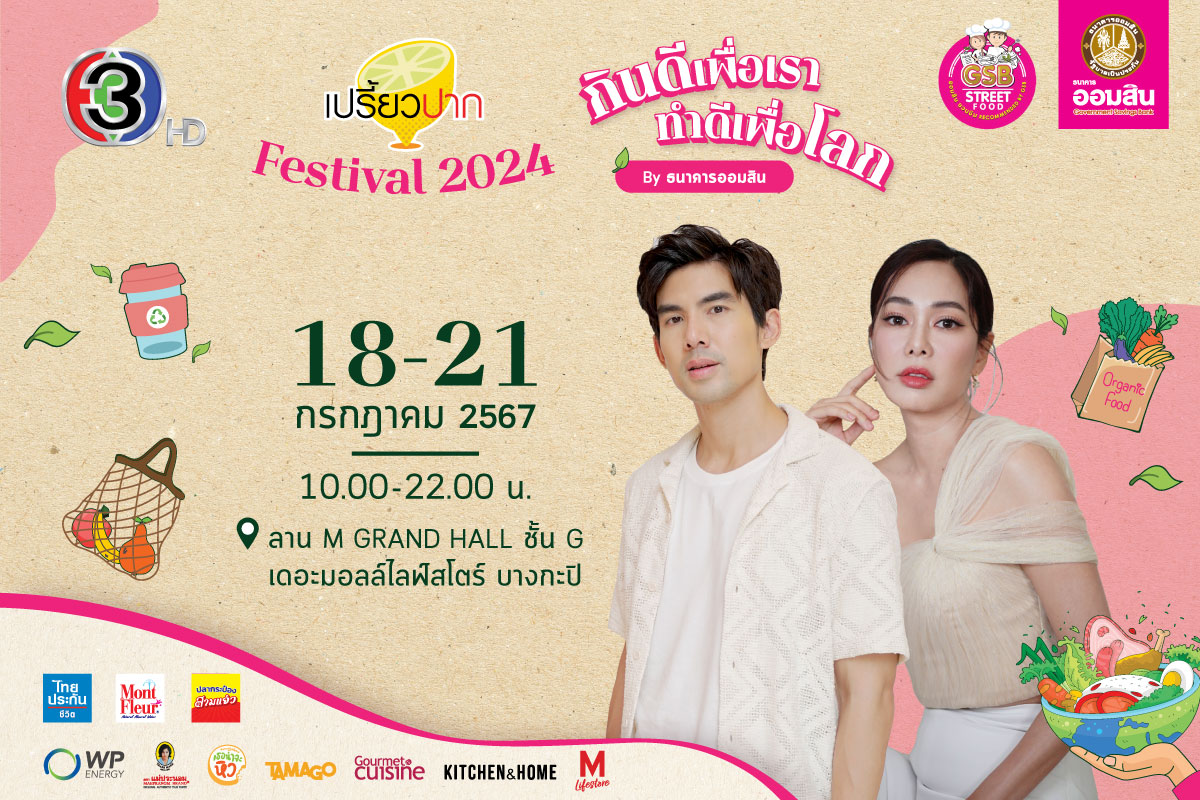 @ รายการเปรี้ยวปาก รายการวาไรตี้กิน-เที่ยว ออกอากาศทางช่อง 3HD (ช่อง 33) ดำเนินรายการโดย 2 พิธีกรคู่ซี้สายกิน “เต๋อ-ฉันทวิชช์ ธนะเสวี และ จอย-รินลณี ศรีเพ็ญ” ฉลองยิ่งใหญ่ครบรอบ 20 ปี ก้าวเข้าสู่ปีที่ 21 จัดงานมหกรรมร้านอร่อยตามรอยเปรี้ยวปาก “เปรี้ยวปาก Festival 2024” กินดีเพื่อเรา ทำดีเพื่อโลก By ธนาคารออมสิน ขนทัพ 80 ร้านอร่อยเด็ดทั่วไทย ทั้งร้านสตรีทฟู้ดคิวยาว ร้านสุดปังที่เคยออกรายการเปรี้ยวปาก ร้านดังในTikTok และร้านศิลปินดารา มารวมไว้ในที่เดียว พร้อมสนุกกับกิจกรรมความบันเทิงจากศิลปินอีกมากมาย วันที่ 18-21 กรกฎาคม 2567 เวลา 10.00-22.00 น. ณ ลาน M GRAND HALL ชั้น G เดอะมอลล์ไลฟ์สโตร์ บางกะปิ