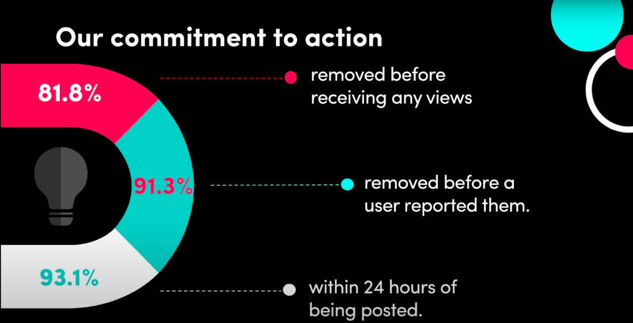 นายไคลด์ นูนส์ Head of Direct Sales SEA ของ ติ๊กต็อก กล่าวว่า ในช่วงต้นปีที่ผ่านมา คลิปวิดีโอกว่า 62 ล้านคลิปที่ละเมิดหลักเกณฑ์ หรือเงื่อนไขในการให้บริการของ ติ๊กต็อกถูกลบออกไปทันทีหลังจากอัพโหลดเข้าสู่ระบบภายใน 24 ชั่วโมง และนับเป็นสัดส่วนไม่ถึง 1% ของคลิปวิดีโอที่ถูกอัพโหลดเข้าสู่แพลตฟอร์ม และยังมีสถิติที่น่าสนใจคือกว่า 81.8% ของวิดีโอถูกลบออกไปก่อนเกิดการรับชม 91.3% ถูกลบออกจากระบบก่อนผู้ใช้รีพอร์ตเข้ามา