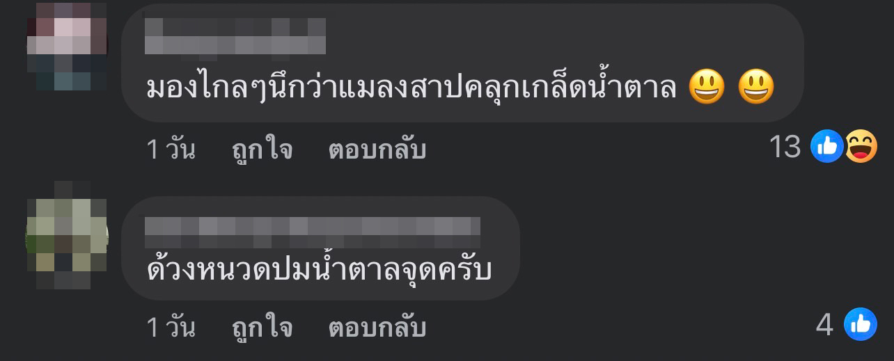 อย่างไรก็ตาม เมื่อเรื่องราวดังกล่าวถูกเผยแพร่ออกไป ต่างมีชาวเน็ตเข้ามาแสดงความคิดเห็นกันเป็นจำนวนมาก โดยมีชาวเน็ตเข้ามาเฉลยว่า แมลงชนิดนี้ คือ “ด้วงนวดปมน้ำตาลจุด” บางคอมเมนต์ก็เข้ามาแห่แซวว่า “มองไกลๆ นึกว่าแมลงสาบคลุกเกล็ดน้ำตาล, แมลงสาบติดเพชร” อีกด้วย..