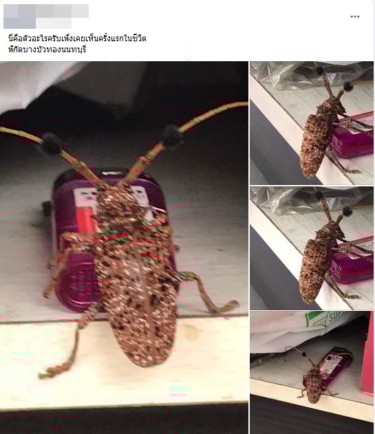 โดยผู้โพสต์ระบุข้อความว่า “นี่คือตัวอะไรครับ เพิ่งเคยเห็นครั้งแรกในชีวิต” อีกทั้งยังเผยให้เห็นภาพแมลง 6 ขา รูปร่างคล้ายแมลงสาบ ผิวหนังมีจุดสีดำสลับขาว เป็นจุดเล็กๆ จนดูระยิบระยับ นอกจากนี้ยังมีเขายาว และมีขนกลมๆ สีดำตรงกลางเขาอีกด้วย