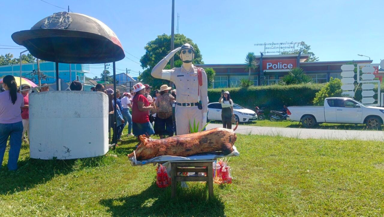 เมื่อวันที่ 11 ส.ค. ที่บริเวณสี่แยกไฟแดงสิชล อ.สิชล จ.นครศรีธรรมราช นางอาภาพร ใจห้าว อายุ 50 ปี พร้อมด้วยสามี ลูกสาว ญาติพี่น้องและเพื่อนบ้าน ประมาณ 30 คน ร่วมกันทำพิธีแก้บนจ่าเฉย ซึ่งเป็นรูปปั้นตำรวจยืนอยู่บริเวณสี่แยกไฟแดง แก้บนด้วยหมูย่าง 1 ตัว รำกลองยาวรอบจ่าเฉย 9 รอบ ซึ่งบรรยากาศเป็นไปอย่างสนุกสนาน ทำให้ผู้ที่ใช้รถใช้ถนนสัญจรไปมา มองดูกันอย่างแปลกใจ