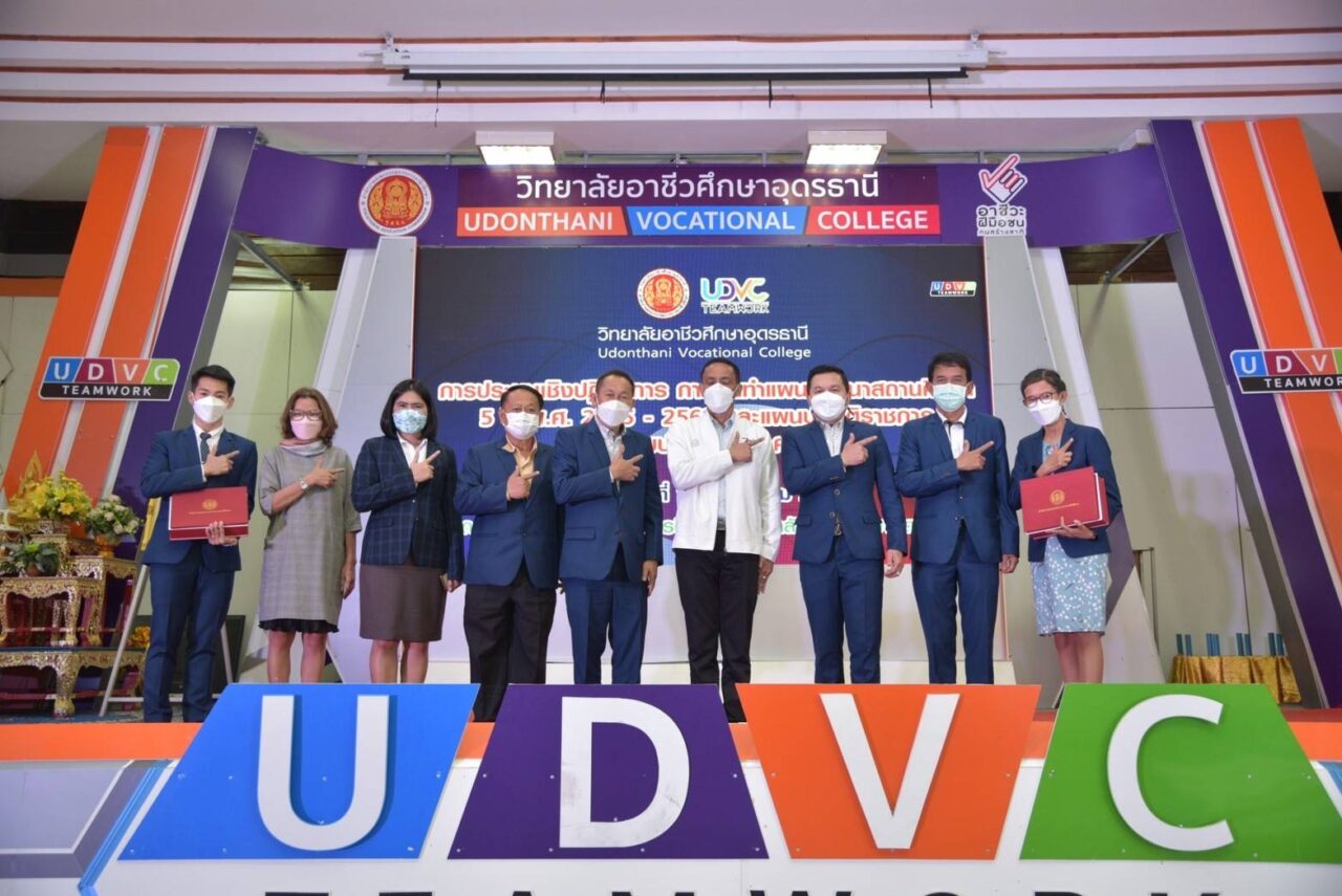 เมื่อวันที่ 17 ต.ค. เรืออากาศโท สมพร ปานดำ รองเลขาธิการคณะกรรมการการอาชีวศึกษา (กอศ.) เปิดเผยว่า เมื่อเร็วๆนี้ตนได้เป็นประธานมอบนโยบายการจัดทำแผนพัฒนาวิทยาลัยอาชีวศึกษาอุดรธานี ระยะ 5 ปี เพื่อพัฒนาสถานศึกษาสู่ความเป็นเลิศ พร้อมรับฟังการนำเสนอผลการวิเคราะห์สภาวะแวดล้อมสถานศึกษา #SWOT Analysis ในการประชุมเชิงปฏิบัติการ การจัดทำแผนพัฒนาสถานศึกษา 5 ปี พ.ศ. 2565-2569 และแผนปฏิบัติราชการประจำปีงบประมาณ 2565 พร้อมกันนี้ ยังได้ให้เกียรติมอบ “รางวัลครูดีศรีอาชีวศึกษา” ประจำปีการศึกษา 2564 ให้กับคุณครูที่ได้รับรางวัลจำนวน 2 คน