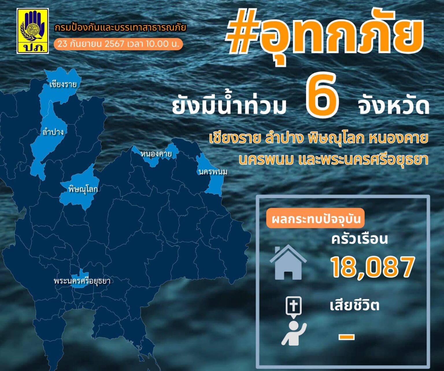 เมื่อวันที่ 23 ก.ย. เวลา 09.30 น. กรมป้องกันและบรรเทาสาธารณภัย (ปภ.) กระทรวงมหาดไทย รายงานสถานการณ์อุทกภัย ว่า ระหว่างวันที่ 16 ส.ค.-23 ก.ย. 2567 เกิดสถานการณ์น้ำท่วมในพื้นที่ 33 จังหวัด ได้แก่ เชียงราย เชียงใหม่ แม่ฮ่องสอน ตาก พะเยา น่าน ลำพูน ลำปาง แพร่ อุตรดิตถ์ สุโขทัย พิษณุโลก นครสวรรค์ เพชรบูรณ์ เลย อุดรธานี หนองคาย นครพนม บึงกาฬ หนองบัวลำภู ปราจีนบุรี อ่างทอง พระนครศรีอยุธยา ปทุมธานี ระยอง ชุมพร สุราษฎร์ธานี ภูเก็ต ยะลา นครศรีธรรมราช พังงา ตรัง สตูล รวม 175 อำเภอ 766 ตำบล 4,017 หมู่บ้าน และมีประชาชนที่ได้รับผลกระทบ 160,739 ครัวเรือน มีผู้เสียชีวิตรวม 46 ราย และได้รับบาดเจ็บรวม 24 คน ซึ่งปัจจุบันยังมีสถานการณ์อุทกภัยในพื้นที่ 6 จังหวัด รวมพื้นที่ได้รับผลกระทบ 27 อำเภอ 130 ตำบล 598 หมู่บ้าน ประชาชนได้รับผลกระทบ 18,087 ครัวเรือน รายละเอียด ดังนี้