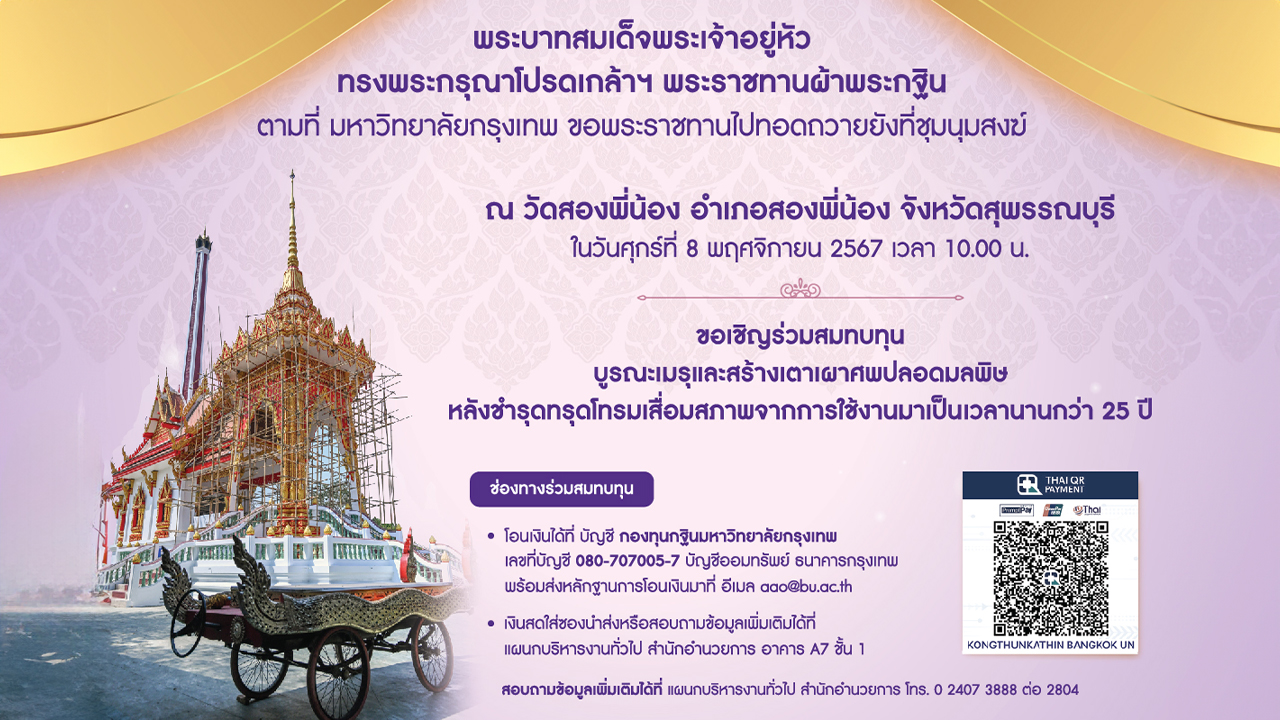 มหาวิทยาลัยกรุงเทพ ขอเชิญร่วมสมทบทุนบูรณะเมรุและสร้างเตาเผาศพปลอดมลพิษ หลังชำรุดทรุดโทรมเสื่อมสภาพจากการใช้งานมาเป็นเวลานานกว่า 25 ปี เพื่อนำไปถวายยังที่ชุมนุมสงฆ์ ณ วัดสองพี่น้อง อำเภอสองพี่น้อง จังหวัดสุพรรณบุรี เพื่อร่วมทำบุญถวายผ้าพระกฐินพระราชทาน ประจำปี 2567 ในวันศุกร์ที่ 8 พฤศจิกายน 2567 ช่องทางร่วมสมทบทุน บัญชี กองทุนกฐินมหาวิทยาลัยกรุงเทพ เลขที่บัญชี 080-707005-7 ธนาคารกรุงเทพ สอบถามเพิ่มเติมที่ สำนักอำนวยการ มหาวิทยาลัยกรุงเทพ โทร.0 2407 3888 ต่อ 2804