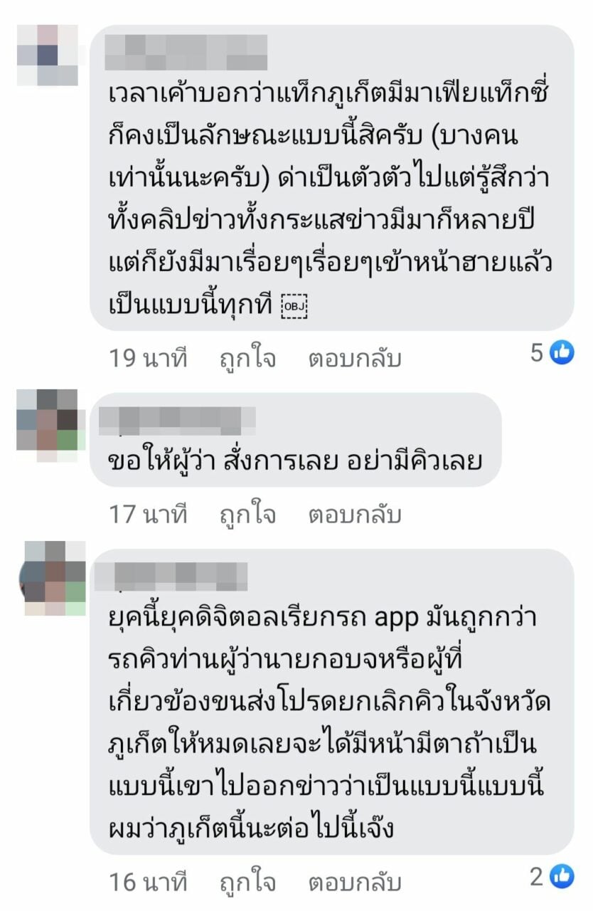 หลังจากแชร์โพสต์ออกไปไม่นาน มีชาวเน็ตเข้ามาคอมเมนท์กันจำนวนมาก อาทิเช่น เวลาเค้าบอกว่าแท็กซี่ภูเก็ตมีมาเฟียแท็กซี่ก็คงเป็นลักษณะแบบนี้สิครับ (บางคนเท่านั้นนะครับ) ด่าเป็นตัวตัวไปแต่รู้สึกว่าทั้งคลิปข่าวทั้งกระแสข่าวมีมาก็หลายปีแต่ก็ยังมีมาเรื่อยๆเรื่อยๆเข้าหน้าฮายแล้วเป็นแบบนี้ทุกที , ยุคนี้ยุคดิจิตอลเรียกรถ app มันถูกกว่ารถคิวท่านผู้ว่านายกอบจ.หรือผู้ที่เกี่ยวข้องขนส่งโปรดยกเลิกคิวในจังหวัดภูเก็ตให้หมดเลยจะได้มีหน้ามีตาถ้าเป็นแบบนี้เขาไปออกข่าวว่าเป็นแบบนี้แบบนี้ผมว่าภูเก็ตนี้นะต่อไปนี้เจ๊ง, พันนี้ หยาบแรง, อะรัยไม่รู้ภาพลักษณ์การท่องเที่ยวเสียกระทบหมด…มีสิทธิอะไรไล่นักท่องเที่ยวลงผมขอถาม, สิทธิของลูกค้าคะ, เกินๆๆๆๆๆไป เป็นต้น