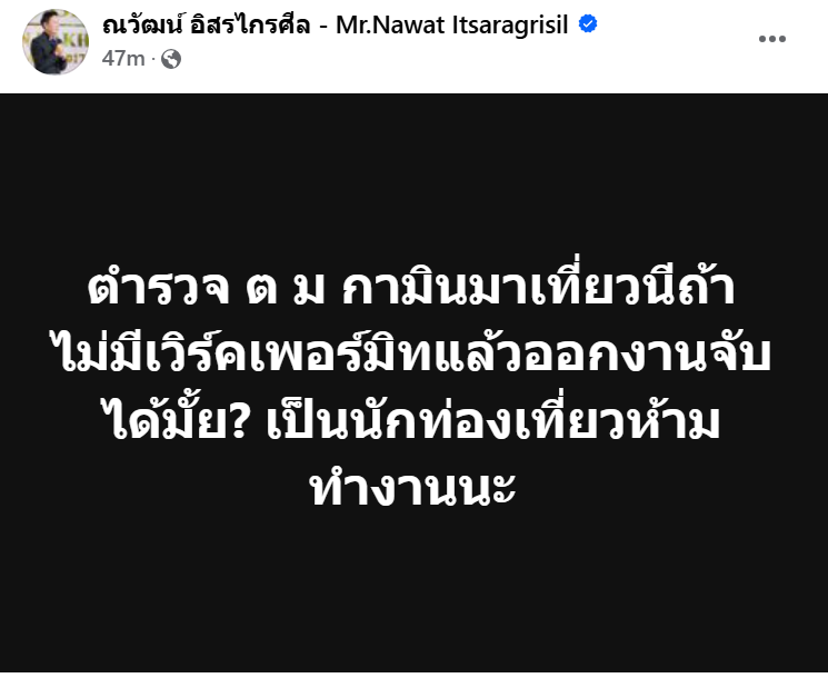 ขณะที่บนโลกออนไลน์เหล่าแฟนคลับ ต่างพากันติดแฮชแท็ก และแสดงความคิดเห็นถึงดราม่าที่เกิดขึ้นกันล้นหลาม ซึ่งทางด้าน “ณวัฒน์ อิสรไกรศีล” ก็ได้ออกมาโพสต์เฟซบุ๊กพร้อมตั้งคำถามเช่นเดียวกันโดยระบุว่า “ตำรวจ ต ม กามินมาเที่ยวนี้ถ้าไม่มีเวิร์คเพอร์มิทแล้วออกงานจับได้มั้ย? เป็นนักท่องเที่ยวห้ามทำงานนะ”…