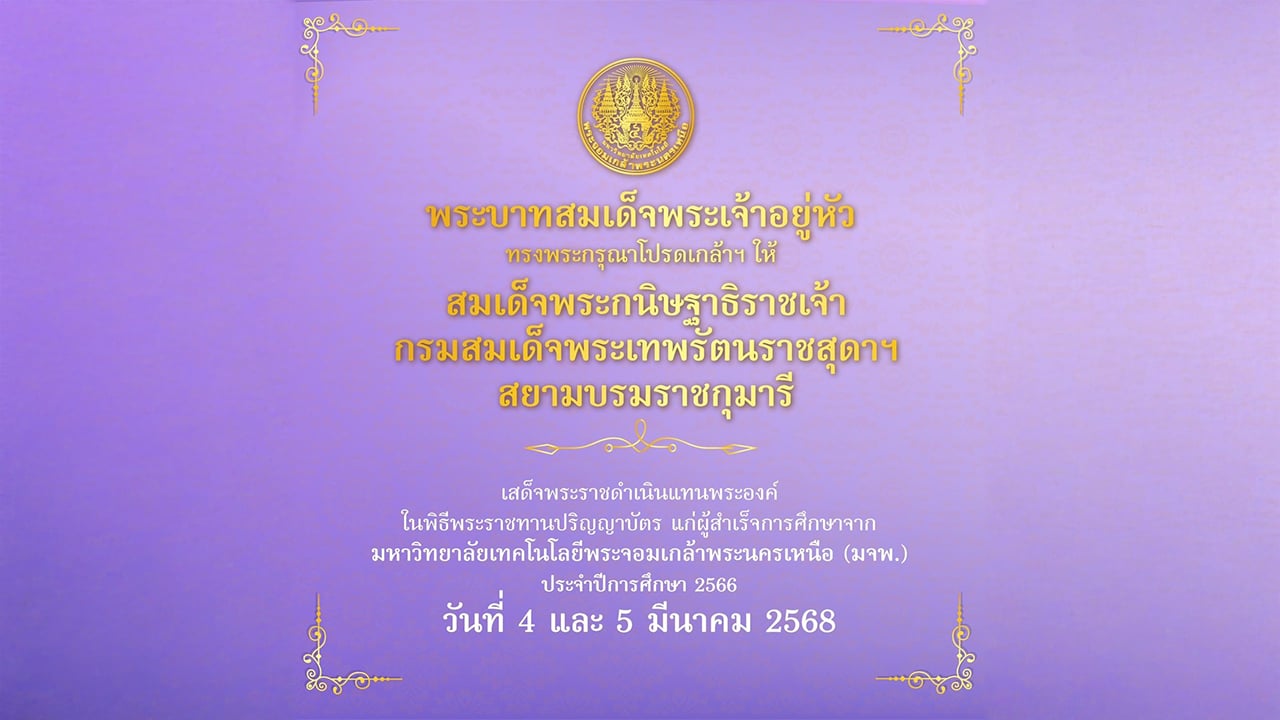 ตามที่พระบาทสมเด็จพระเจ้าอยู่หัว ทรงพระกรุณาโปรดเกล้าโปรดกระหม่อมให้ สมเด็จพระกนิษฐาธิราชเจ้า กรมสมเด็จพระเทพรัตนราชสุดาฯ สยามบรมราชกุมารี เสด็จพระราชดำเนินแทนพระองค์มาพระราชทานปริญญาบัตรแก่ผู้สำเร็จการศึกษาจากมหาวิทยาลัยเทคโนโลยีพระจอมเกล้าพระนครเหนือ (มจพ.) ประจำปีการศึกษา 2566 ในวันอังคารที่ 4 และวันพุธที่ 5 มีนาคม 2568 ณ ศูนย์นิทรรศการและประชุมไบเทค บางนา โดยมีกำหนดการ ดังนี้