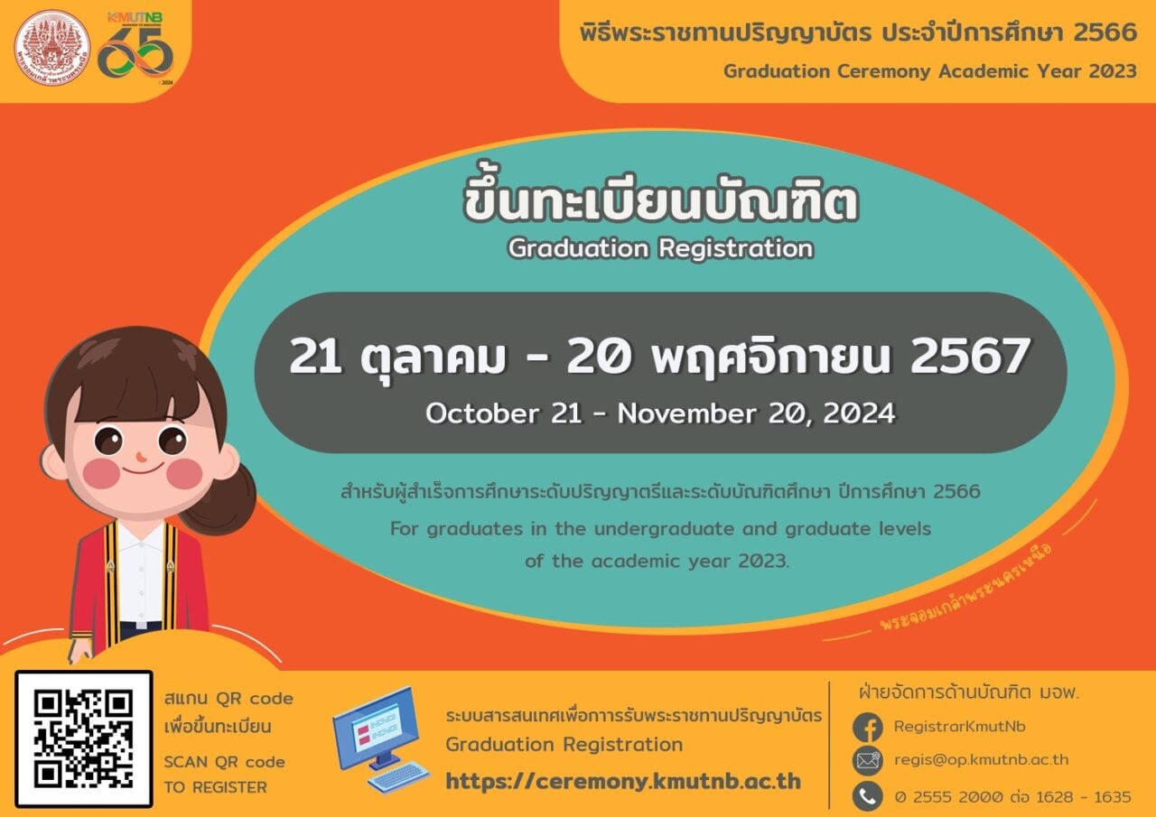มหาวิทยาลัยเทคโนโลยีพระจอมเกล้าพระนครเหนือ จึงขอประกาศให้ผู้สำเร็จการศึกษา ประจำปีการศึกษา 2566 ขึ้นทะเบียนบัณฑิตเพื่อเข้ารับพระราชทานปริญญาบัตร ตั้งแต่วันที่ 21 ตุลาคม – 20 พฤศจิกายน 2567 ผ่านทางเว็บไซต์ https://ceremony.kmutnb.ac.th