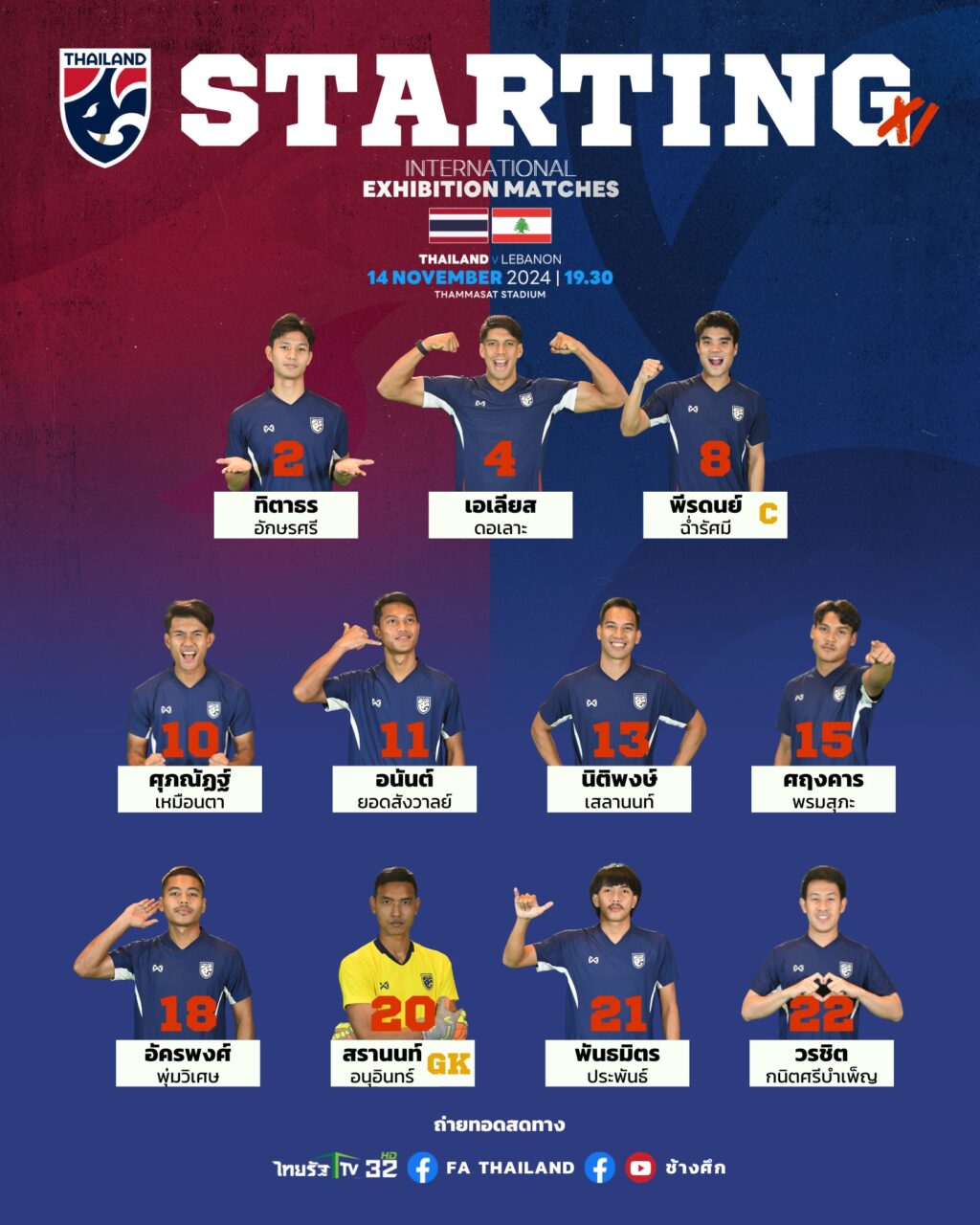 “ช้างศึก” ทีมฟุตบอลทีมชาติไทย จะพบ เลบานอน ในเกมอุ่นเครื่อง วันนี้ (14 พ.ย.) เวลา 19.30 น. ที่ ธรรมศาสตร์ สเตเดียม