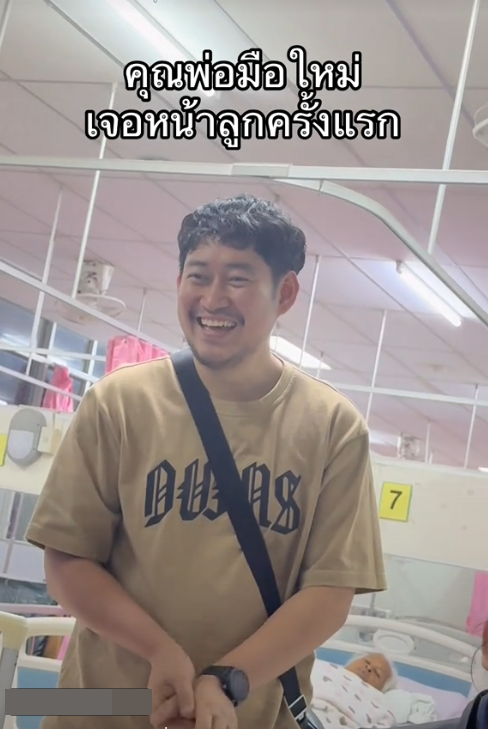 ซึ่งภายในคลิปคุณพ่อแสดงอาการยิ้มไม่หยุดพร้อมพูดว่า ขอล้างมือก่อนนะ และใช้เจลแอลกอฮอล์ที่วางไว้ปลายเตียงกดมาล้าง และถามภรรยาว่า เจ็บมั้ยเธอ ก่อนจะหันไปถามว่า ทำไมไม่มีหมอนให้เธอนอน โดยภรรยาก็รีบตอบทันทีว่า ทางพยาบาลเขาให้นอนราบไปแบบนี้ ซึ่งคุณพ่อมือใหม่ยังแซวภรรยาว่า ดูผอมลงเยอะเลยนะ ทั้งนี้ยังเดินไปหาลูกพร้อมบอกว่า อุ้ยทำไมลูกตัวใหญ่จังเลย เขายังไม่ให้อุ้มเหรอ และก็พยายามใช้เจลแอลกอฮอล์ล้างมือไม่หยุดเลย