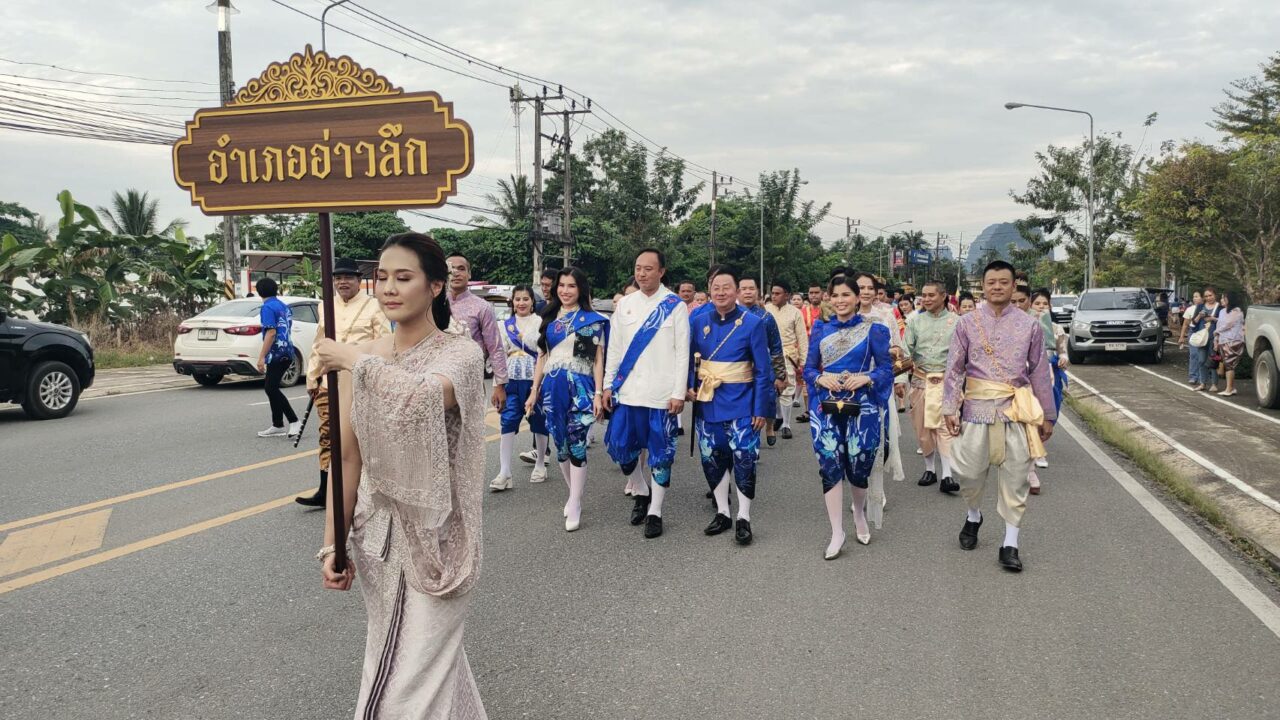 ผู้สื่อข่าวรายงานว่า อำเภออ่าวลึก จังหวัดกระบี่ ได้จัดงานเทศกาลวัฒนธรรมย้อนยุควิถีชีวิตบรรพชน งานรักอ่าวลึก ครั้งที่ 14 ซึ่งจัดขึ้นวันที่ 3-7 ธันวาคม 2567 ที่สนามหน้าที่ว่าการอำเภออ่าวลึก โดยก่อนพิธีเปิด ได้มีการเดินพาเหรดของหน่วยงานราชการและองค์กรปกครองส่วนท้องถิ่นในพื้นที่อำเภออ่าวลึก รวม 12 ขบวน บ่งบอกถึงอัตลักษณ์และวัฒนธรรม ประเพณีอันงดงาม ที่มีการสืบทอดและต่อยอดกันมาแต่ตั้งบรรพชนจนถึงปัจจุบัน พร้อมกันนี้ ผู้ที่ร่วมเดินขบวนพาเหรดได้พร้อมใจกันใส่ชุดไทยโบราณ โดยมีนายถิรเดช ตั้งมั่นก่อกิจ และนายกิตติ กิตติธรกุล สส.กระบี่ พรรคภูมิใจไทย เข้าร่วมแต่งชุดไทยสร้างสีสัน ทำให้บรรยากาศภายในงานเป็นไปด้วยความครึกครื้น