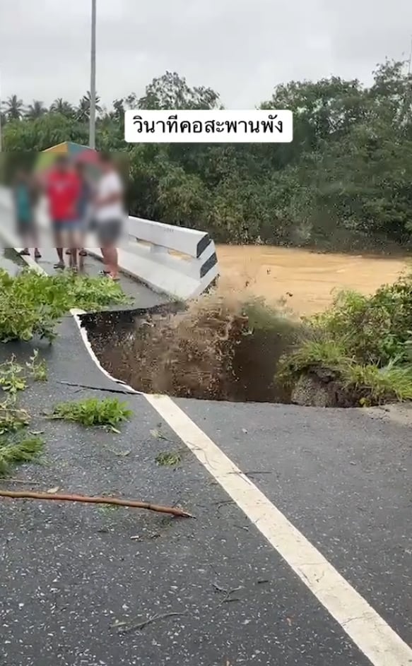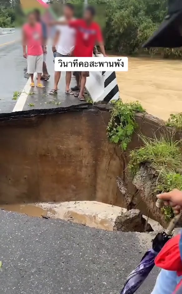 โดยเจ้าของโพสต์ ระบุข้อความว่า “บอกใจว่ายังไหวอยู่ วินาทีคอสะพานพัง” อีกทั้งในคลิปวิดีโอยังเผยให้เห็น ชายหนุ่ม 3 คน ยืนอยู่บนสะพาน และจู่ๆ สะพานก็ถล่มต่อหน้าต่อตากลุ่มชายหนุ่ม อีกทั้งยังพบว่าใต้พื้นถนนนั้นถูกน้ำเซาะจนเป็นโพรง แต่ความโชคร้ายยังมีความโชคดี ที่กลุ่มชายดังกล่าวยังคงปลอดภัย
