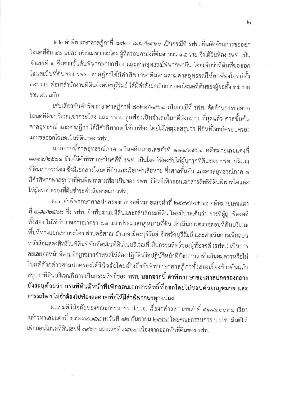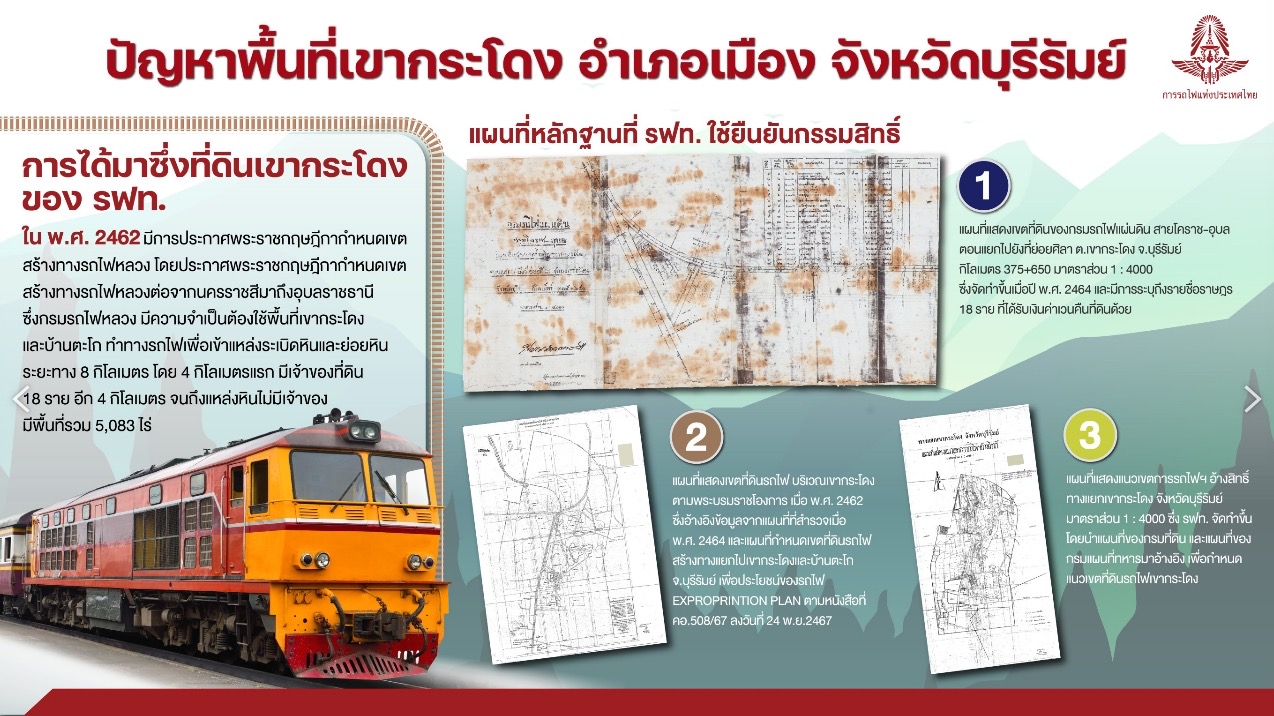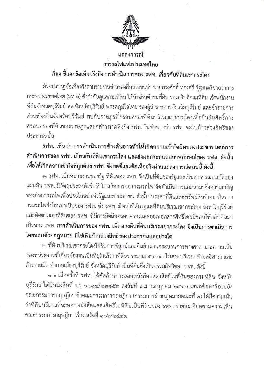รฟท. ขอชี้แจงว่า รฟท. เป็นหน่วยงานของรัฐ ที่ดินของ รฟท. จึงเป็นที่ดินของรัฐ และเป็นสาธารณสมบัติของแผ่นดิน ซึ่ง รฟท. มีวัตถุประสงค์เพื่อรับโอนกิจการของกรมรถไฟ ดังนั้นบรรดาที่ดิน และทรัพย์สินที่เคยเป็นของกรมรถไฟจึงโอนมาเป็นของ รฟท. ซึ่ง รฟท. มีหน้าที่ต้องดูแลที่ดินบริเวณเขากระโดง จังหวัดบุรีรัมย์ และติดตามเอาที่ดินของ รฟท. ที่มีการยึดถือครอบครอง และออกเอกสารสิทธิโดยมิชอบให้กลับคืนมาเป็นของ รฟท. อย่างไรก็ตามยืนยันว่าการดำเนินการของ รฟท. เพื่อทวงคืนที่ดินบริเวณเขากระโดง จึงเป็นการดำเนินการโดยชอบด้วยกฎหมาย ไม่ใช่เป็นการก้าวล่วงสิทธิของประชาชนแต่อย่างใด