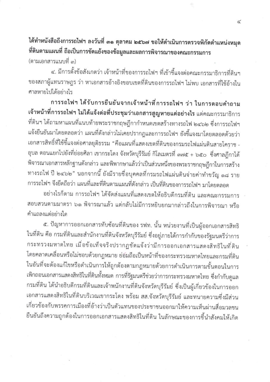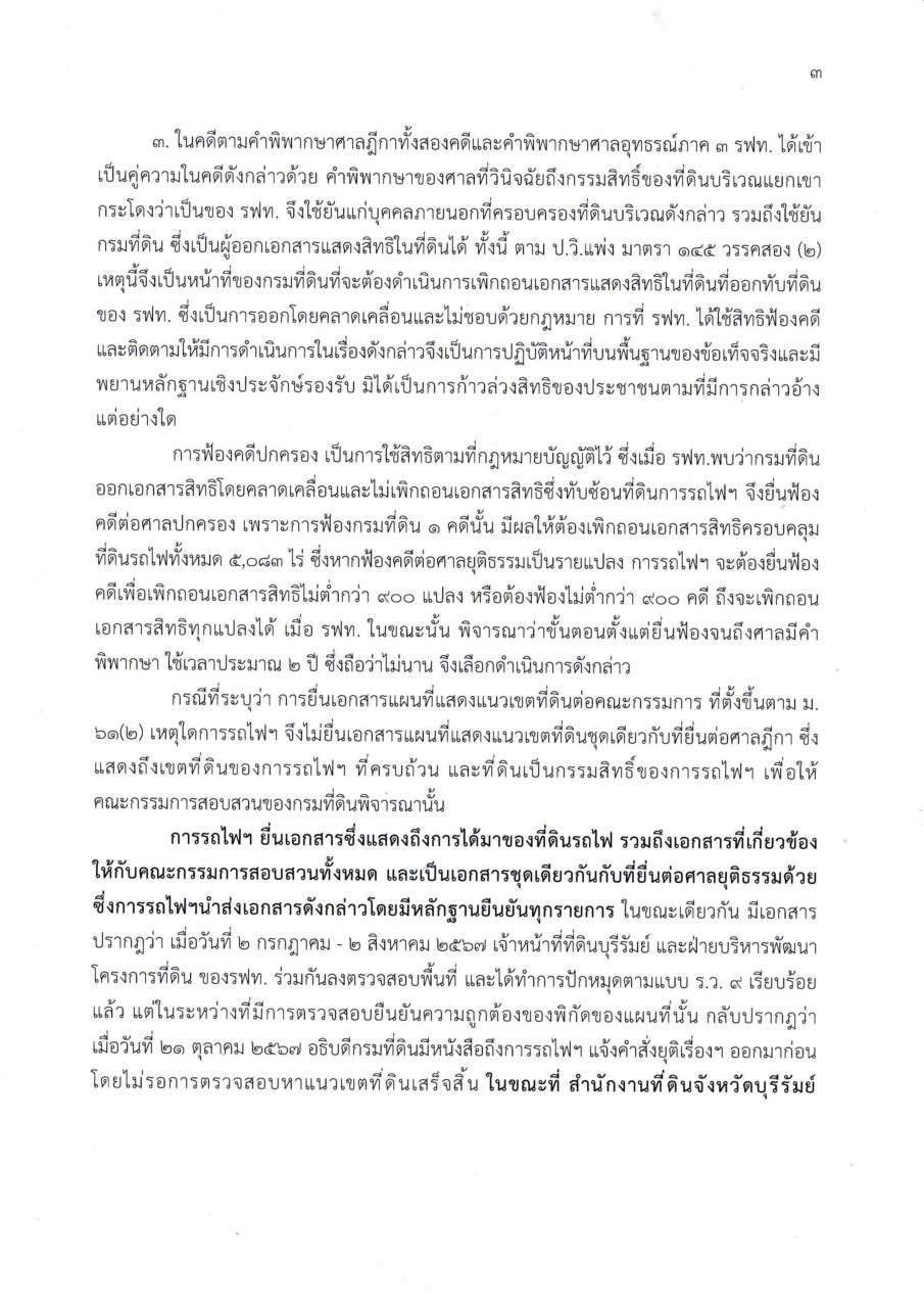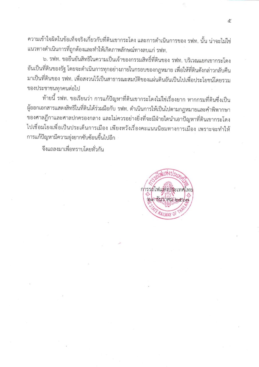 ดังนั้นจึงเป็นหน้าที่ของกรมที่ดินที่ต้องดำเนินการเพิกถอนเอกสารแสดงสิทธิในที่ดินที่ออกทับที่ดินของ รฟท. ซึ่งเป็นการออกโดยคลาดเคลื่อน และไม่ชอบด้วยกฎหมาย อีกทั้งไม่ได้เป็นการก้าวล่วงสิทธิของประชาชนตามที่มีการกล่าวอ้างแต่อย่างใด ส่วนกรณีที่มีคำถามว่า เหตุใด รฟท. จึงไม่ยื่นเอกสารแผนที่แสดงแนวเขตที่ดินชุดเดียวกับที่ยื่นต่อศาลฎีกา ซึ่งแสดงถึงเขตที่ดินของ รฟท. ที่ครบถ้วน และที่ดินเป็นกรรมสิทธิ์ของ รฟท. เพื่อให้คณะกรรมการสอบสวนของกรมที่ดินพิจารณานั้น ขอชี้แจงว่า รฟท. ยื่นเอกสารซึ่งแสดงถึงการได้มาของที่ดินรถไฟ รวมถึงเอกสารที่เกี่ยวข้อง ให้กับคณะกรรมการสอบสวนทั้งหมด และเป็นเอกสารชุดเดียวกันกับที่ยื่นต่อศาลยุติธรรมด้วย