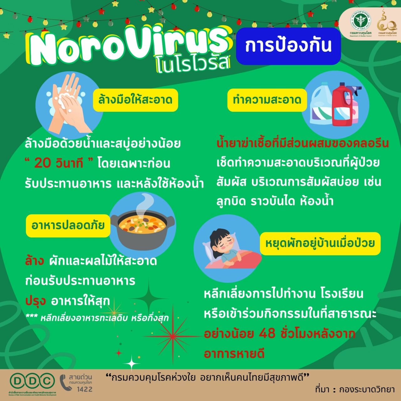 กรมควบคุมโรค กระทรวงสาธารณสุข บอกเล่าความรู้เกี่ยวสาเหตุและวิธีป้องกันเชื้อร้ายนี้ ว่า “โนโรไวรัส” เป็นไวรัสที่ติดต่อได้ง่าย มีความทนทานต่อความร้อนและน้ำยาฆ่าเชื้อต่างๆได้ดี ขณะเดียวกัน เชื้อดังกล่าวมักถูกตรวจพบมากขึ้นในช่วงฤดูหนาว เนื่องจากสภาวะอากาศที่เย็น ทำให้เชื้อเจริญเติบโตได้ดี ส่งผลให้อาหารและน้ำดื่มมีโอกาสปนเปื้อน จึงมีโอกาสพบผู้ป่วยโรคอุจจาระร่วงเฉียบพลันจากเชื้อไวรัสชนิดนี้เพิ่มขึ้นในฤดูหนาว
