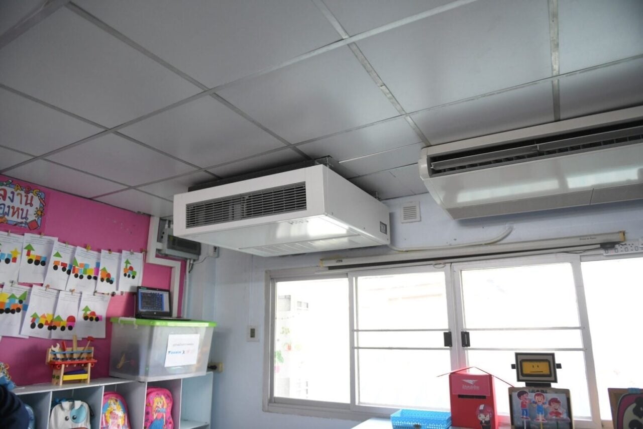 ซึ่งแนวทางการดำเนินการปรับปรุงห้องระบบเปิดให้เป็นระบบปิด มีขนาดห้องเรียน 2 ขนาด กล่าวคือ ขนาดห้องเรียนที่มีพื้นที่มากกว่า 35 ตร.ม. และขนาดห้องเรียนที่มีพื้นที่น้อยกว่าหรือเท่ากับ 35 ตร.ม. โดยได้ทำการติดตั้งเครื่องปรับอากาศแบบแขวน ระบบ INVERTER พร้อมพัดลมระบายอากาศ เดินระบบ MAIN BREAKER ภายในห้อง ติดตั้งเครื่องวัดค่าคาร์บอนไดออกไซต์ CO2 ภาพอากาศ