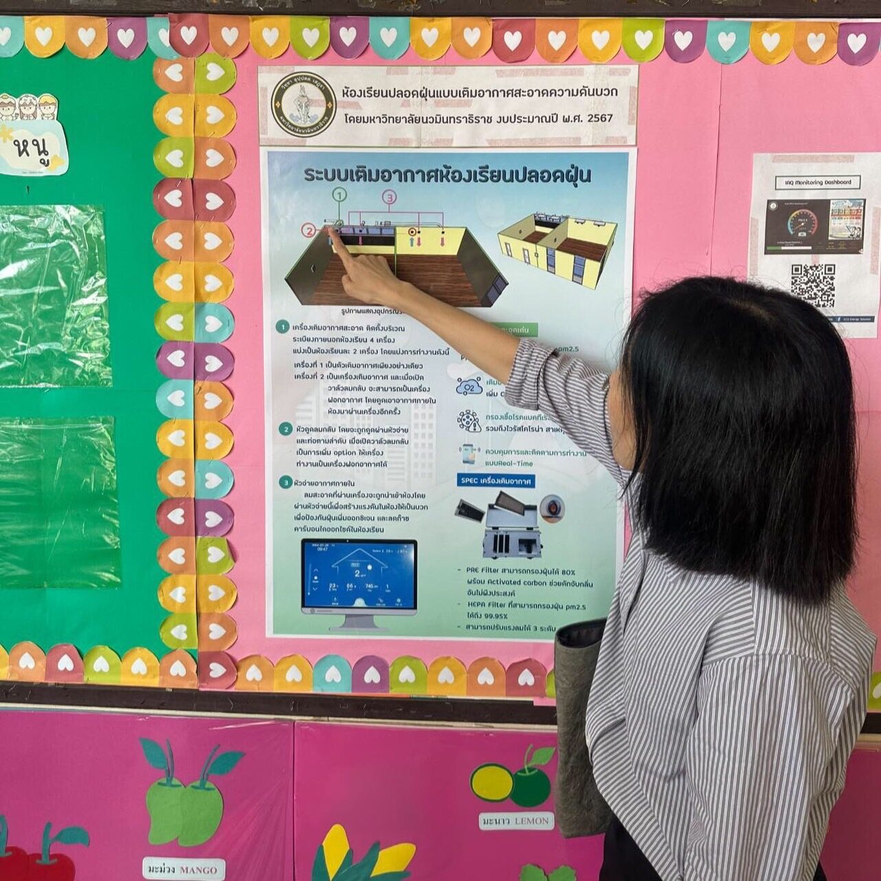 อีกทั้ง สำนักการศึกษาจะดำเนินการปรับปรุงห้องเรียนปลอดฝุ่น (Clean Air Shelter) สำหรับกลุ่มเด็กอนุบาล อายุประมาณ 4-6 ปี (อนุบาล 1-2) ในปีงบประมาณ พ.ศ. 2568 จากจำนวนโรงเรียน 429 โรงเรียน โดยมีห้องเรียนจำนวนทั้งสิ้น 1,996 ห้อง แบ่งออกเป็น 1. ห้องเรียนเดิมมีแอร์ จำนวน 696 ห้อง 2. ห้อง CSR หรือห้อง+แอร์ จำนวน 48 ห้อง 3. ห้องที่ปรับปรุงโดยสำนักงานเขต จำนวน 227 ห้อง และ 4. ห้องที่ปรับปรุงโดยสำนักการศึกษา จำนวน 995 ห้อง ปัจจุบันอยู่ระหว่างดำเนินการจัดทำ TOR จำนวน 6 กลุ่มเขต กรุงเทพกลาง จำนวน 49 ห้อง กรุงเทพเหนือ จำนวน 126 ห้อง กรุงเทพใต้ จำนวน 29 ห้อง กรุงเทพตะวันออก จำนวน 437 ห้อง กรุงธนเหนือ จำนวน 140 ห้อง กรุงธนใต้ จำนวน 214 ห้อง รวมทั้งสิ้นจำนวน 995 ห้อง