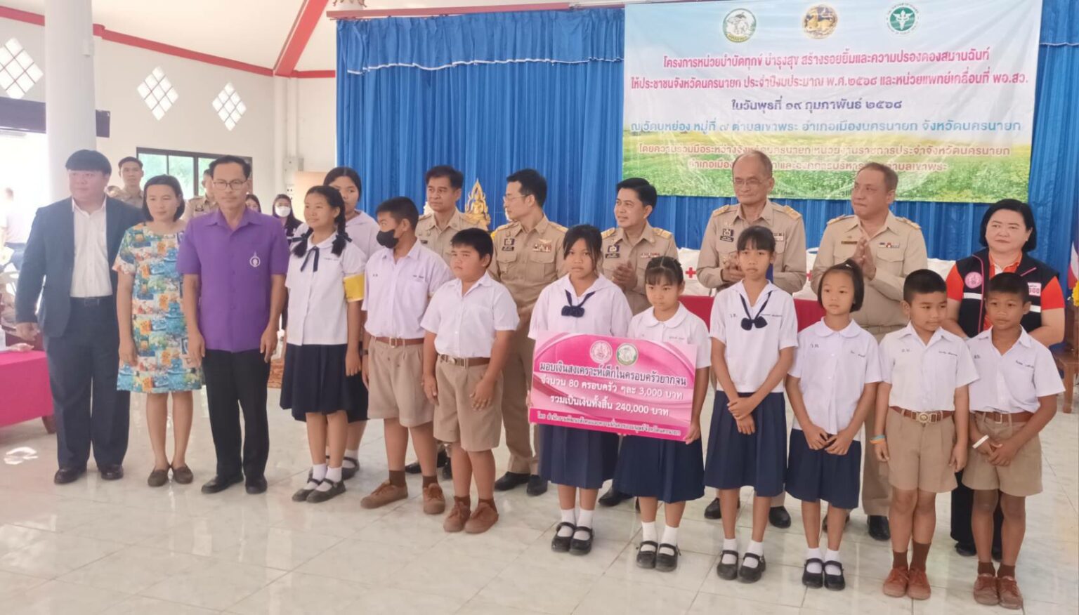 จากนั้นกาชาดจังหวัดนครนายก พร้อมด้วยหน่วยงานที่เกี่ยวข้องได้ร่วมกันมอบถุงยังชีพของกาชาดนครนายก ให้กับประชาชนและทุนการศึกษาให้กับเด็กนักเรียนรวม3โรงเรียนทุนละ3,000บาทอีกด้วย.